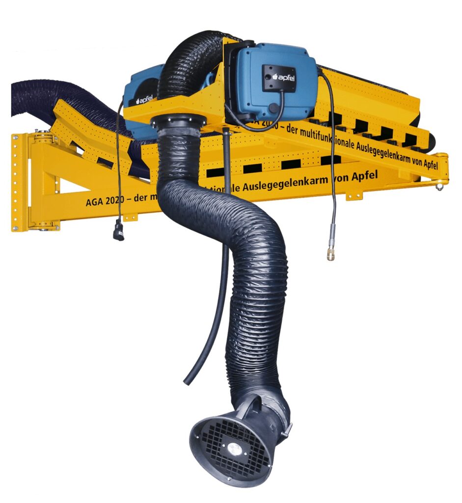 - Absaugung, Strom- und Pressluftversorgung von oben über die schwenkbaren Auslegerarme