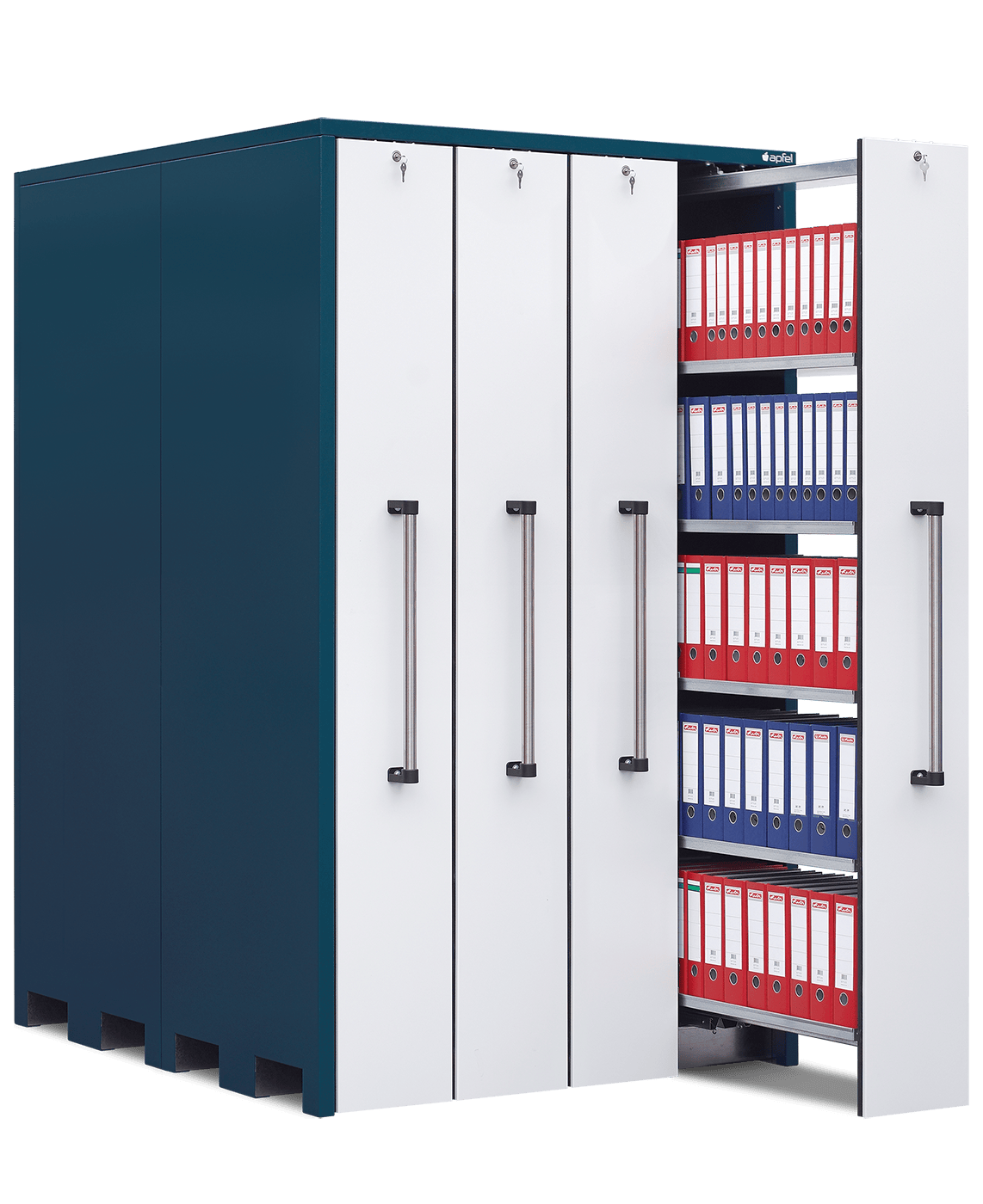 • Sichere und staubarme Lagerung: Mitlaufende Räder, beidseitige Gummilippen und einzeln abschließbare Auszüge schützen die gelagerten Ordner zuverlässig vor Staub und unbefugtem Zugriff.