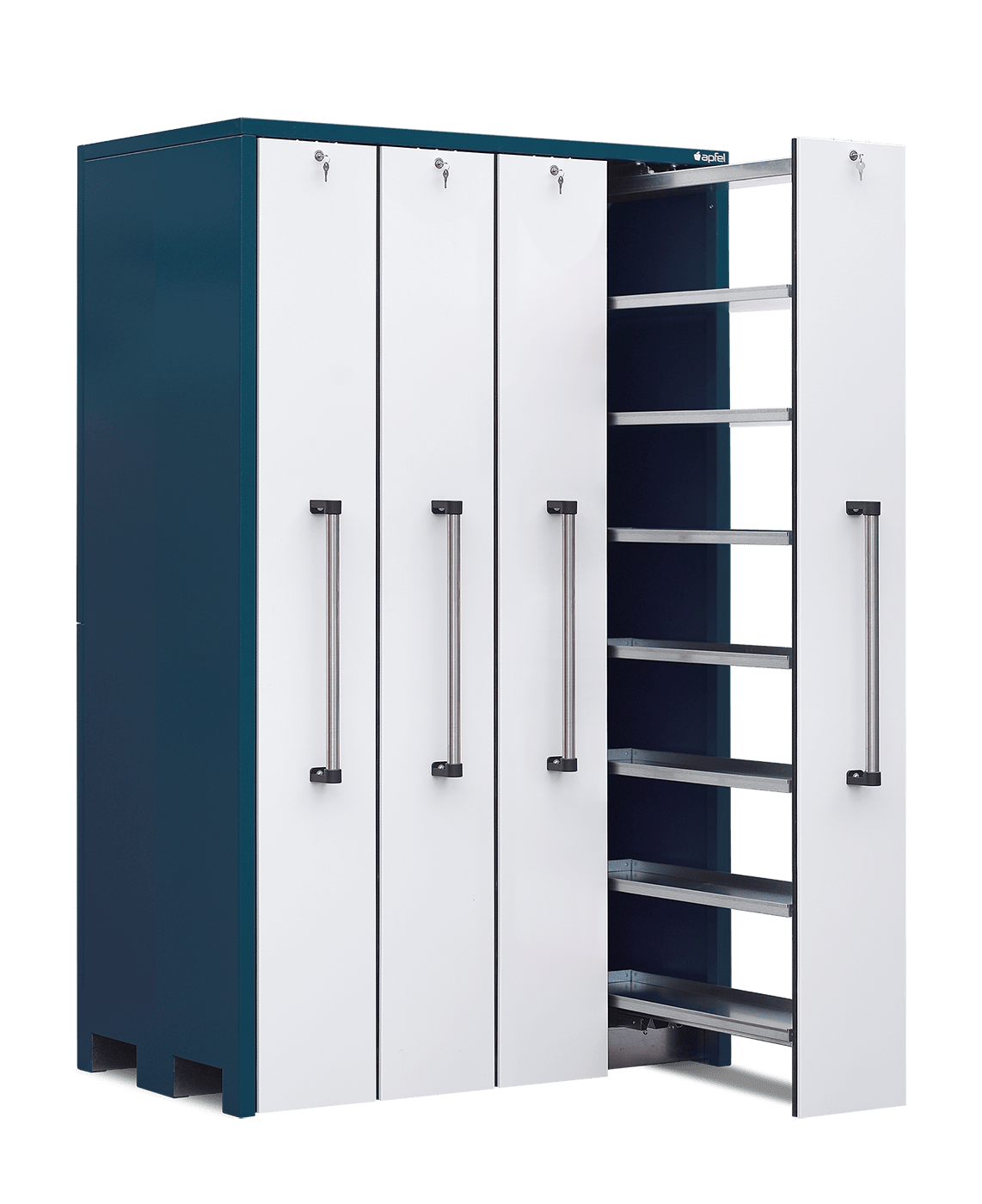 - Stabile und langlebige Bauweise: Pulverbeschichtetes Stahlblech, mitlaufende Räder an jedem Auszug und einzeln abschließbare Auszüge sorgen für einen sicheren Betrieb und hohe Langlebigkeit im täglichen Einsatz.