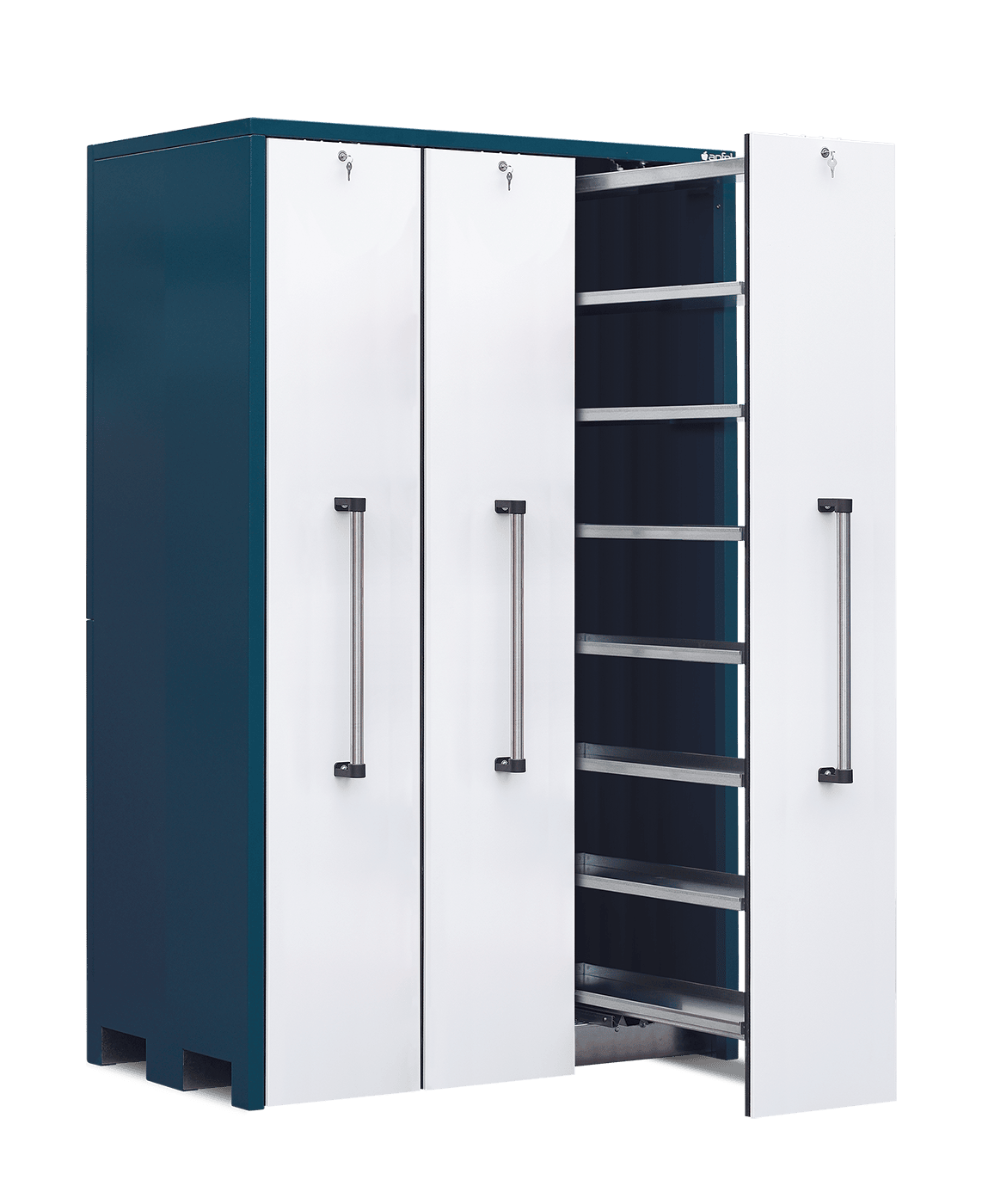 - Stabile und langlebige Bauweise: Pulverbeschichtetes Stahlblech, mitlaufende Räder an jedem Auszug und einzeln abschließbare Auszüge sorgen für einen sicheren Betrieb und hohe Langlebigkeit im täglichen Einsatz.