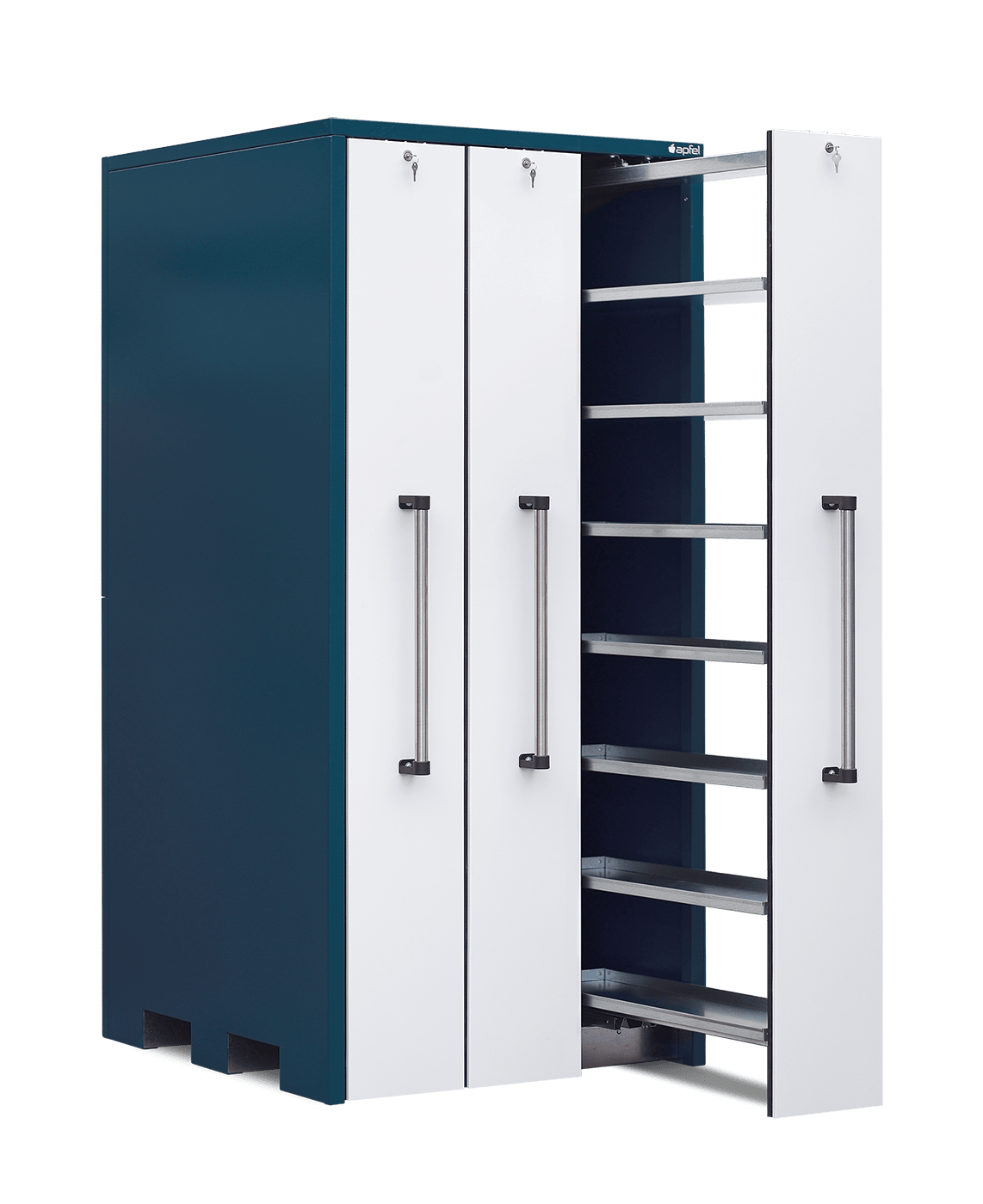 - Vormontierte Universalwannen für maximalen Komfort: Drei Vertikalauszüge à 300 mm Breite sind bereits mit insgesamt 21 robusten Lagerwannen bestückt. Sieben Universalwannen pro Auszug ermöglichen eine vielseitige und sofort einsatzbereite Nutzung für unterschiedlichste Lagergüter.