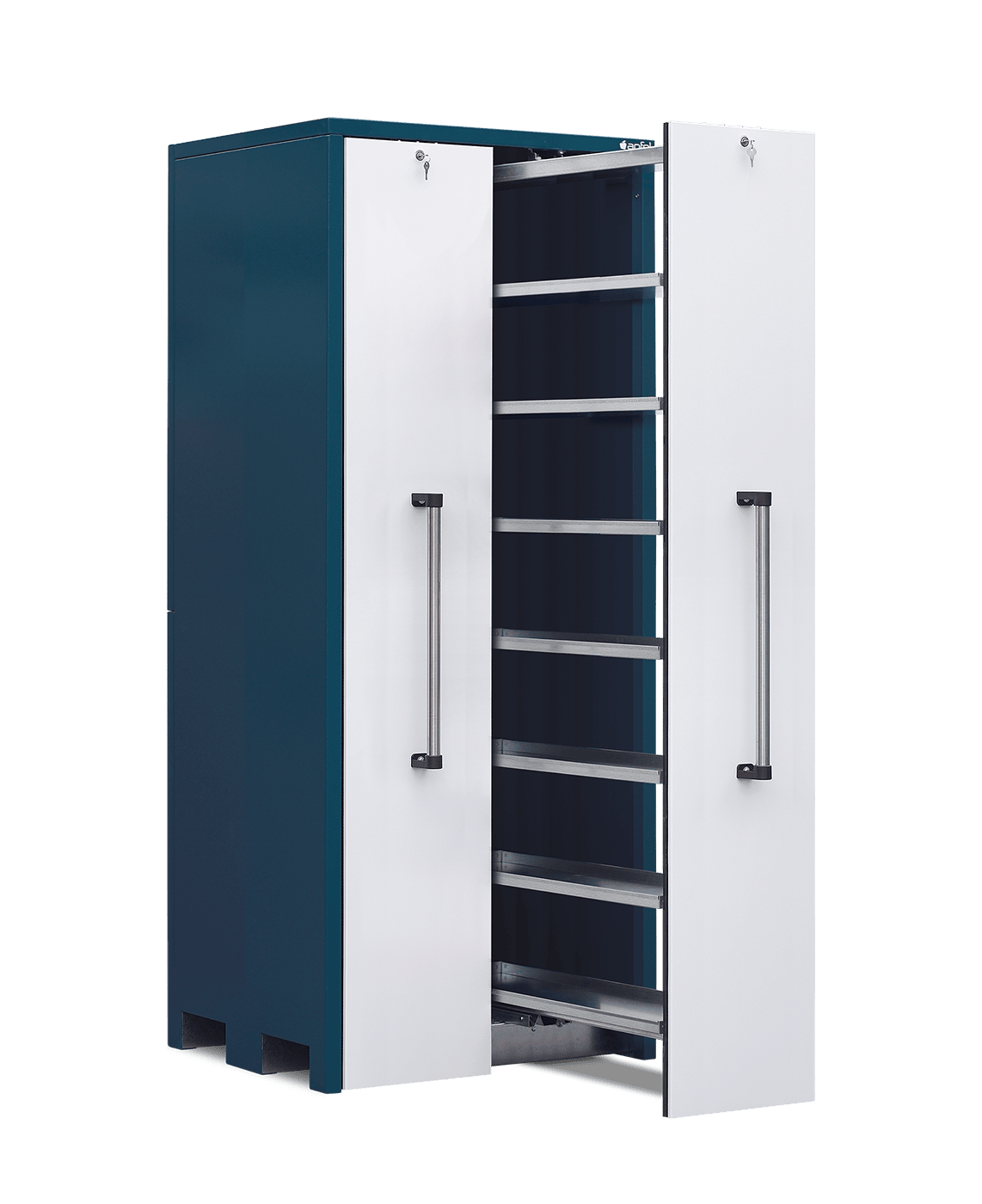 - Stabile und langlebige Bauweise: Pulverbeschichtetes Stahlblech, mitlaufende Räder an jedem Auszug und einzeln abschließbare Auszüge sorgen für einen sicheren Betrieb und hohe Langlebigkeit im täglichen Einsatz.
