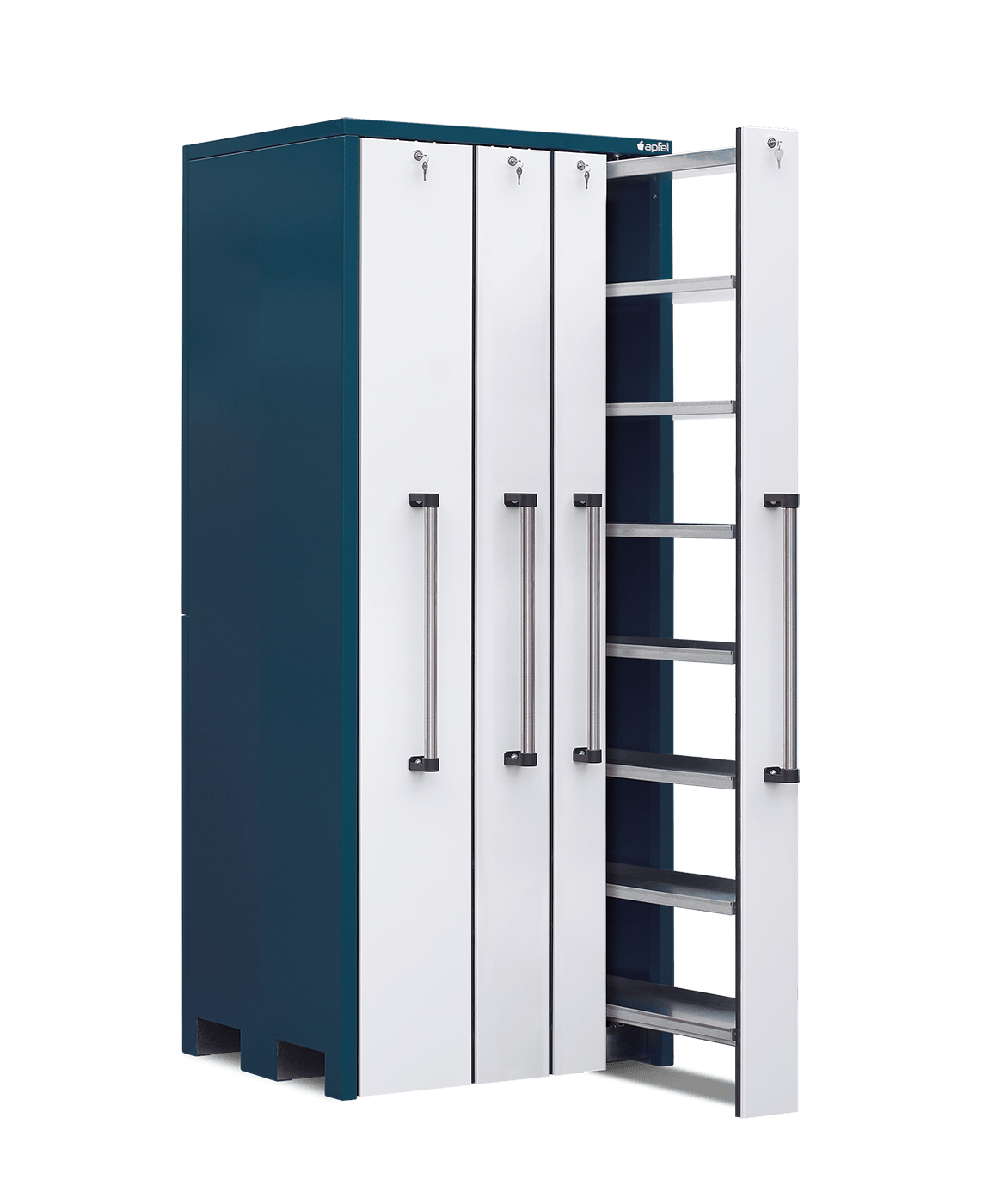 - Stabile und langlebige Bauweise: Pulverbeschichtetes Stahlblech, mitlaufende Räder an jedem Auszug und einzeln abschließbare Auszüge sorgen für einen sicheren Betrieb und hohe Langlebigkeit im täglichen Einsatz.