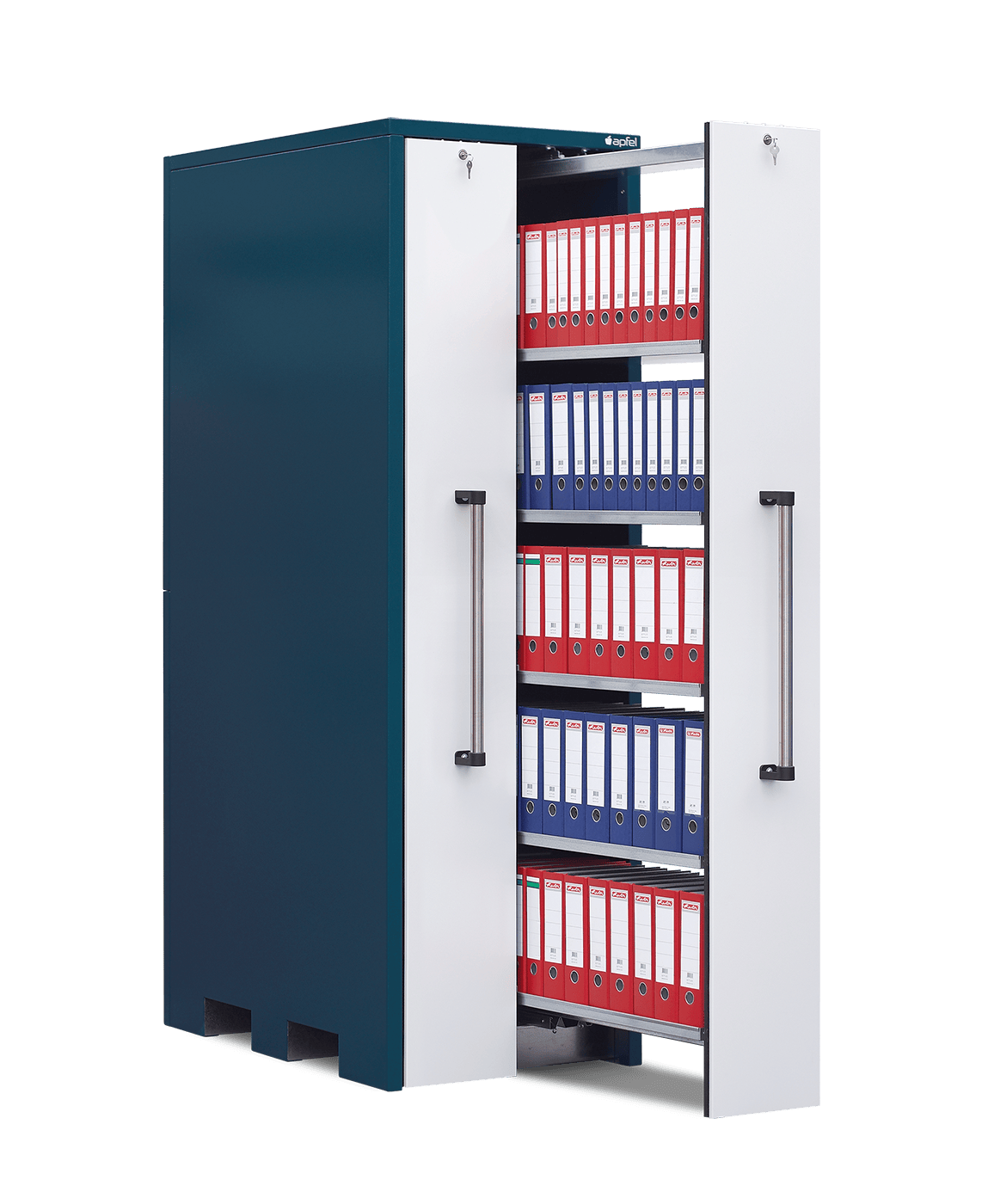 • Sichere und staubarme Lagerung: Mitlaufende Räder, beidseitige Gummilippen und einzeln abschließbare Auszüge schützen die gelagerten Ordner zuverlässig vor Staub und unbefugtem Zugriff.