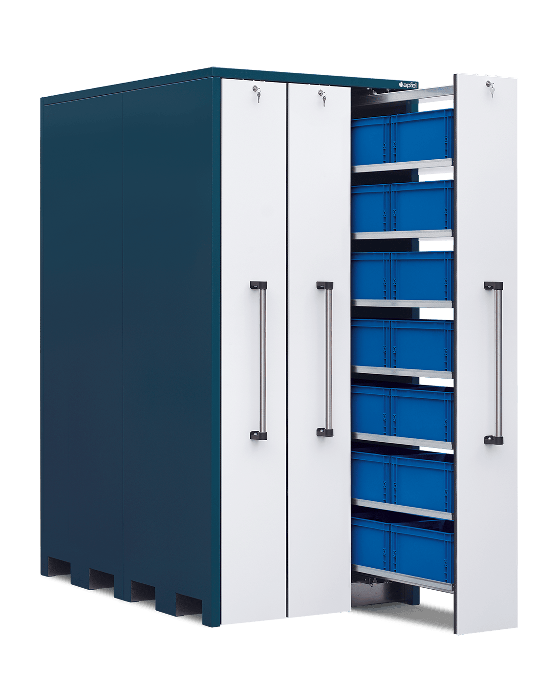 - Sichere und staubarme Lagerung: Mitlaufende Räder, beidseitige Gummilippen und abschließbare Auszüge schützen den Inhalt zuverlässig vor Staub und unbefugtem Zugriff.