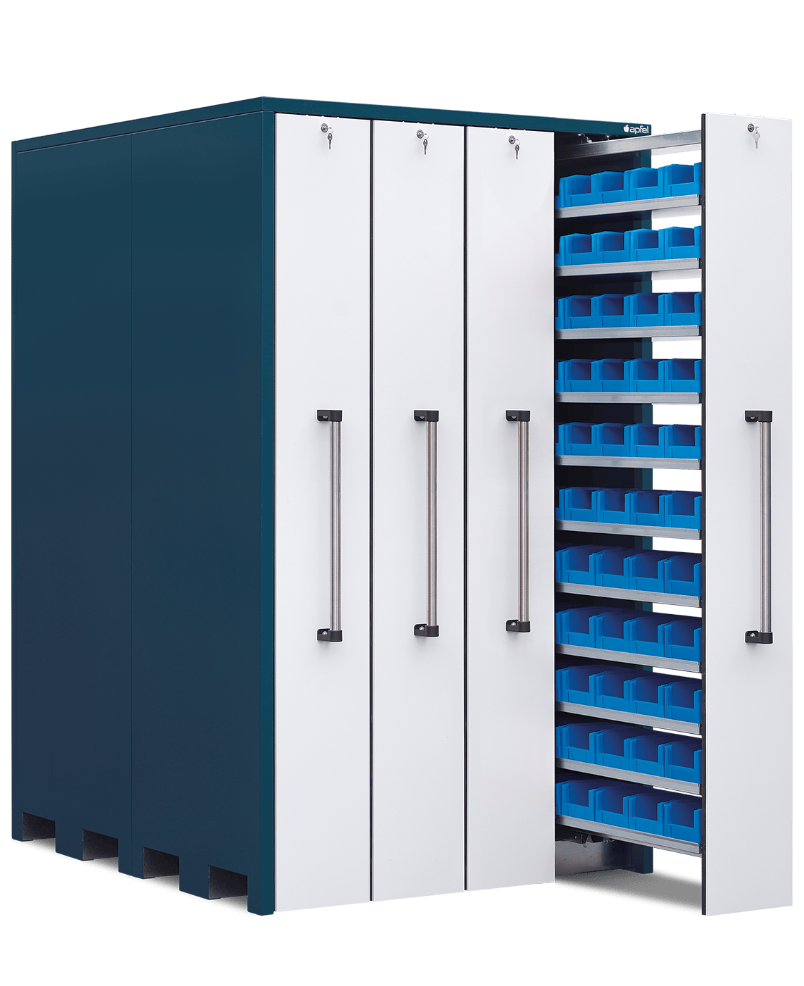 - Sichere und staubarme Lagerung: Mitlaufende Räder, beidseitige Gummilippen und abschließbare Auszüge schützen den Inhalt zuverlässig vor Staub und unbefugtem Zugriff.
