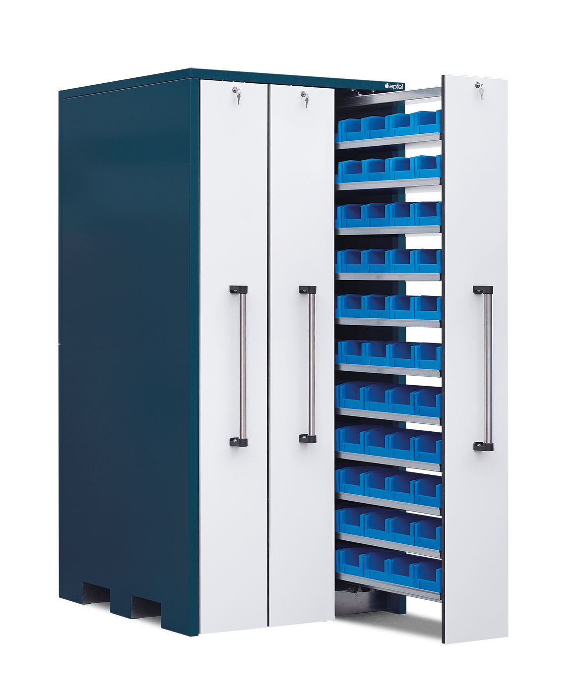 • Optimal zur übersichtlichen Aufbewahrung von Kleinteilen: Drei Vertikalauszüge à 300 mm Breite bieten Platz für 33 Lagerwannen und 231 Lagersichtkästen Nr. 50 mit den Maßen 290 mm Tiefe, 140 mm Breite und 130 mm Höhe.
