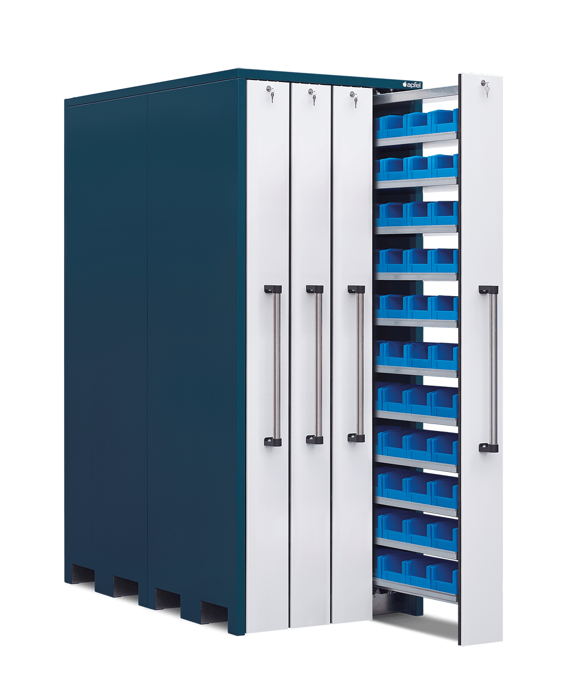 - Sichere und staubarme Lagerung: Mitlaufende Räder, beidseitige Gummilippen und abschließbare Auszüge schützen den Inhalt zuverlässig vor Staub und unbefugtem Zugriff.