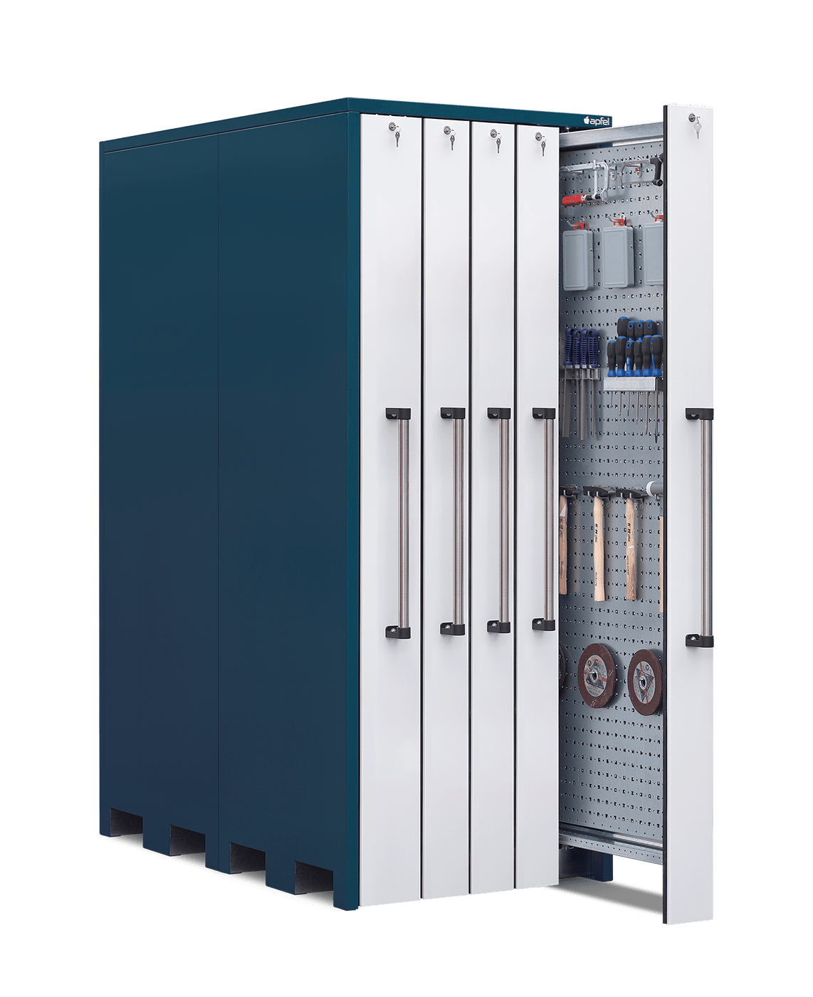 - Optimal zur übersichtlichen Lagerung von Werkzeugen: Ein Vertikalauszug à 200 mm Breite und vier Vertikalauszüge à 150 mm Breite schaffen eine ausgewogene Kombination für verschiedenste Materialien.
