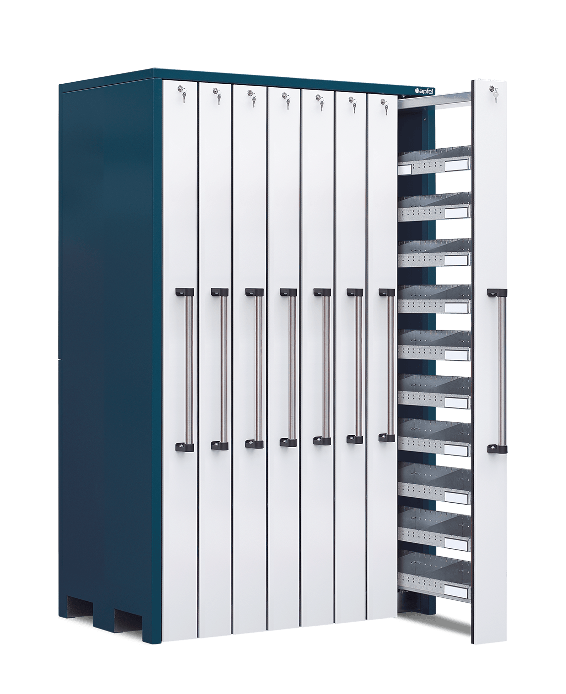 - Optimal zur übersichtlichen Lagerung von Schüttgut: Acht Vertikalauszüge à 150 mm Breite bieten Platz für insgesamt 80 Schüttgutwannen mit je zehn abgeschrägten Behältern.