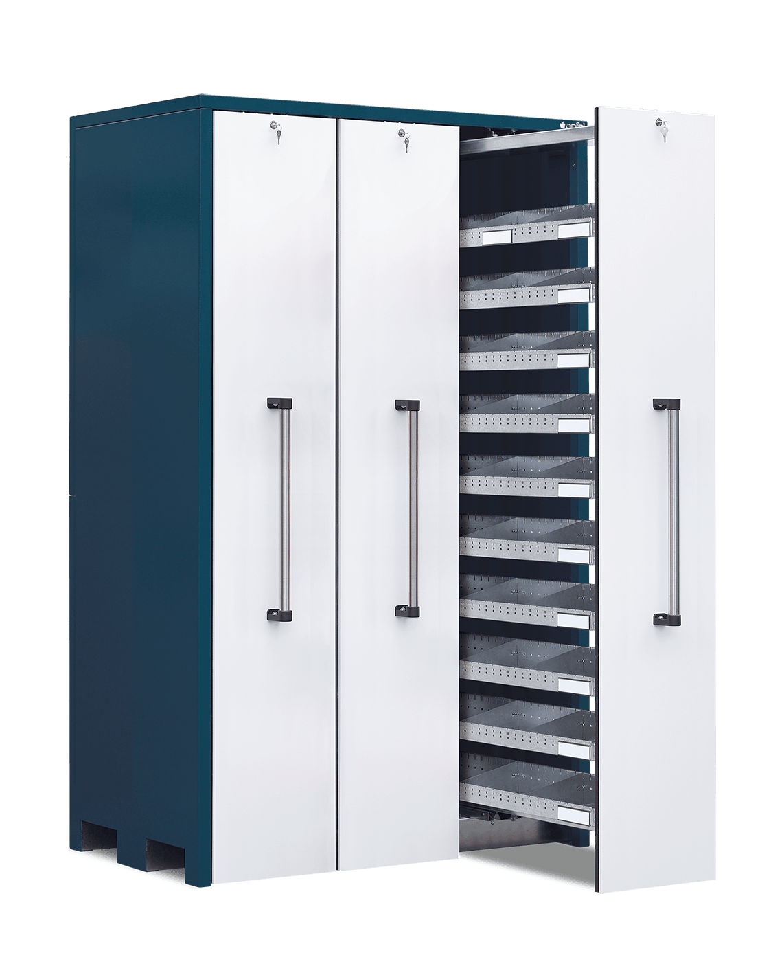 • Lagerschrank mit 3 Vertikalauszügen à 400 mm Breite mit je 300 kg Traglast