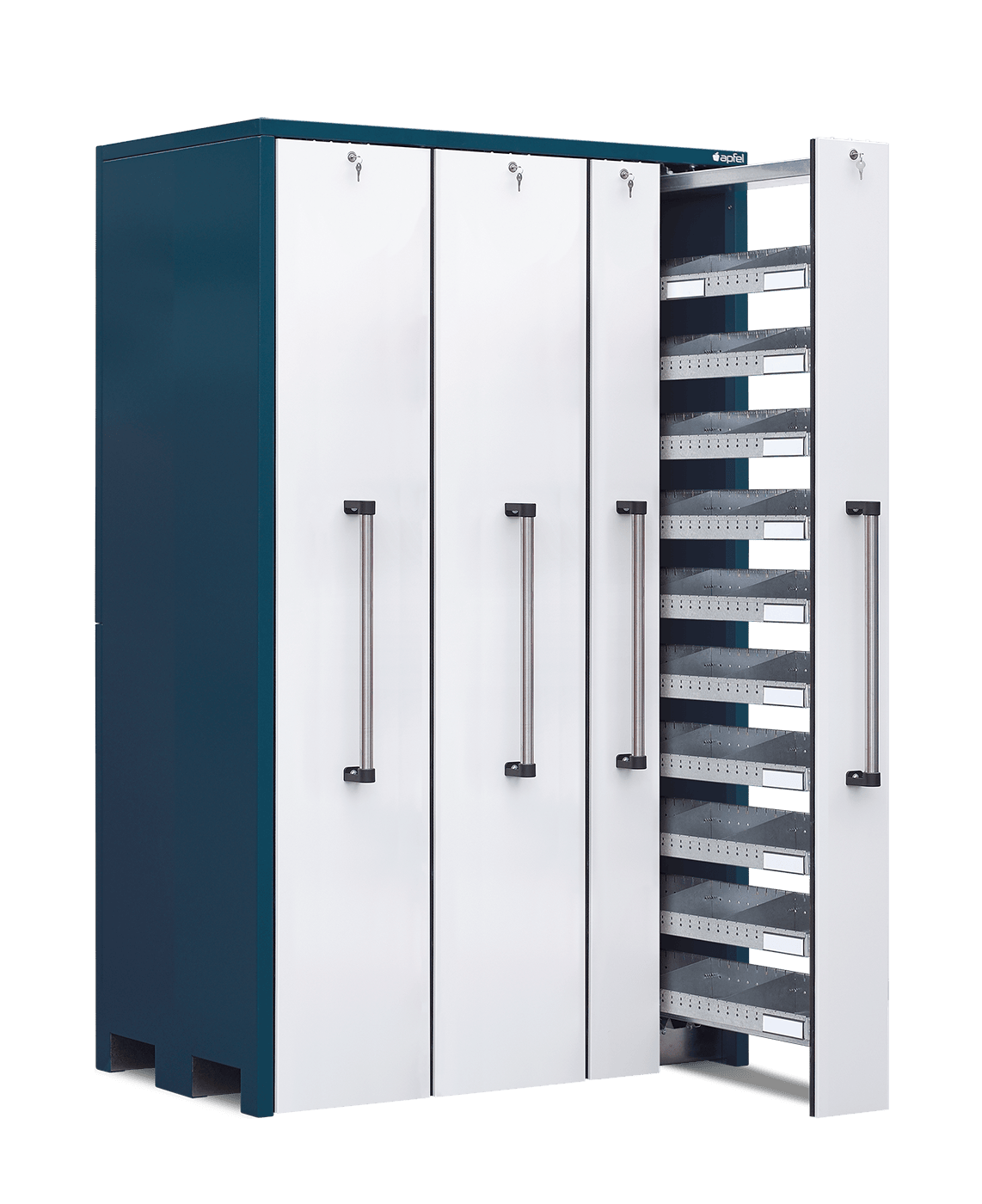 • Optimal zur übersichtlichen Lagerung von Schüttgut: Zwei Vertikalauszüge à 400 mm Breite und zwei Vertikalauszüge à 200 mm Breite bieten Platz für insgesamt 40 Schüttgutwannen mit je zehn abgeschrägten Behältern.