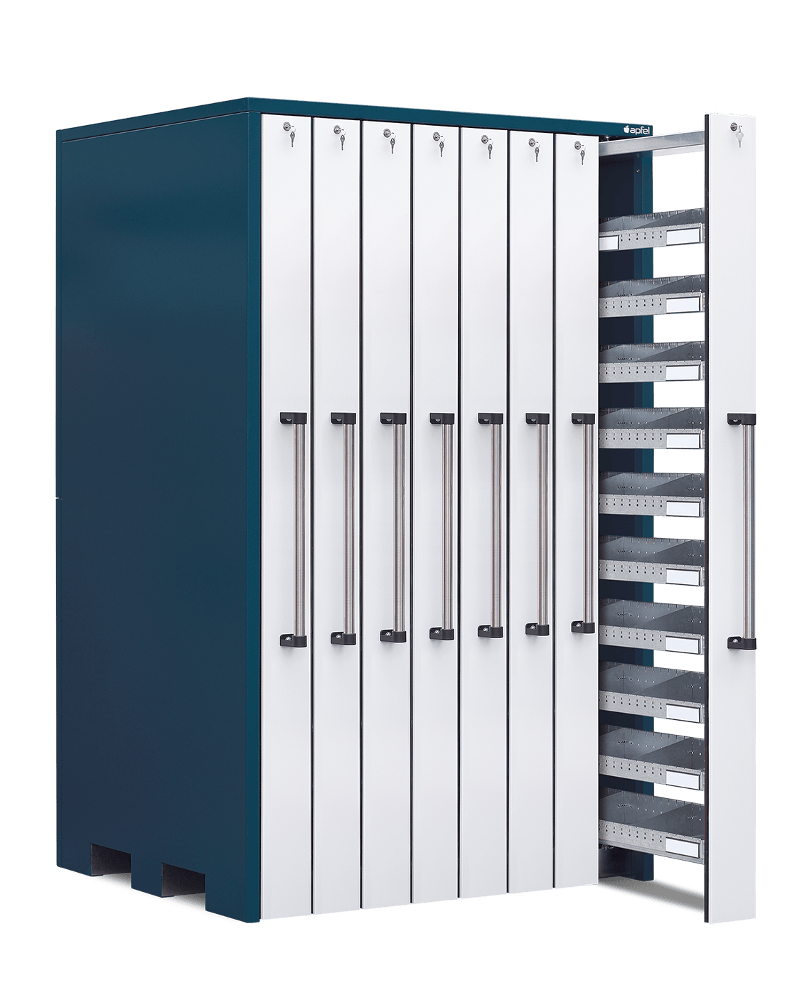 - Optimal zur übersichtlichen Lagerung von Schüttgut: Acht Vertikalauszüge à 150 mm Breite bieten Platz für insgesamt 80 Schüttgutwannen mit je zehn abgeschrägten Behältern.