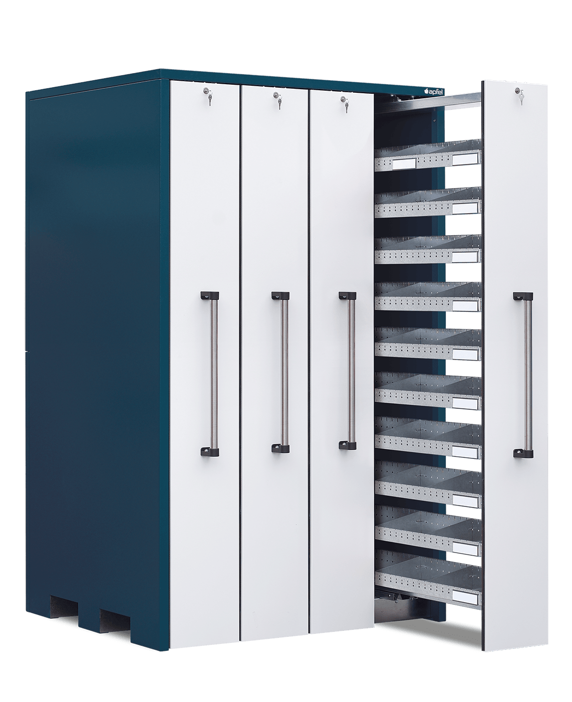 - Optimal zur übersichtlichen Lagerung von Schüttgut: Vier Vertikalauszüge à 300 mm Breite bieten Platz für insgesamt 40 Schüttgutwannen mit je zehn abgeschrägten Behältern.