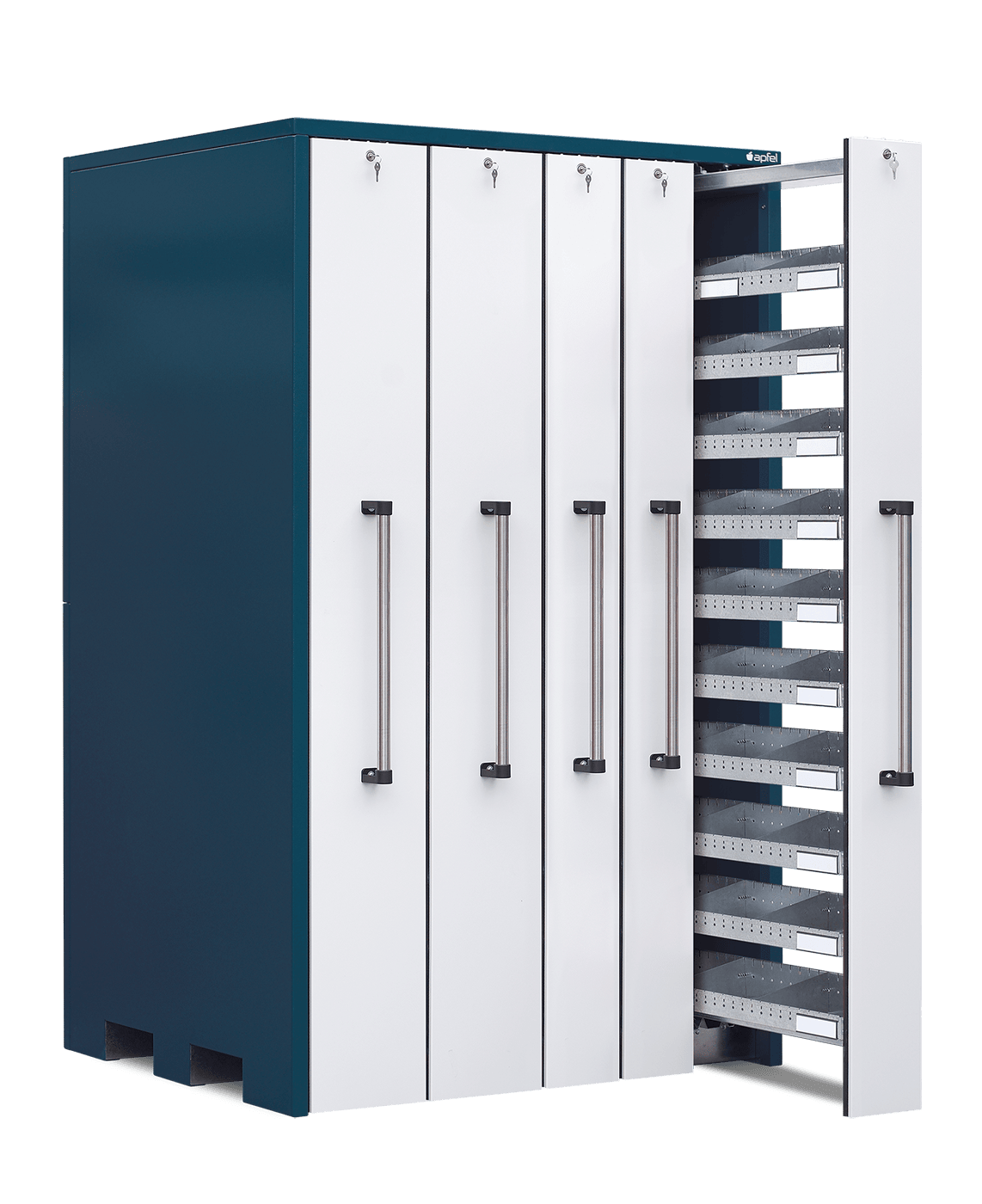• Sichere und staubarme Lagerung: Mitlaufende Räder, beidseitige Gummilippen und einzeln abschließbare Auszüge schützen die gelagerten Artikel zuverlässig vor Staub und unbefugtem Zugriff.