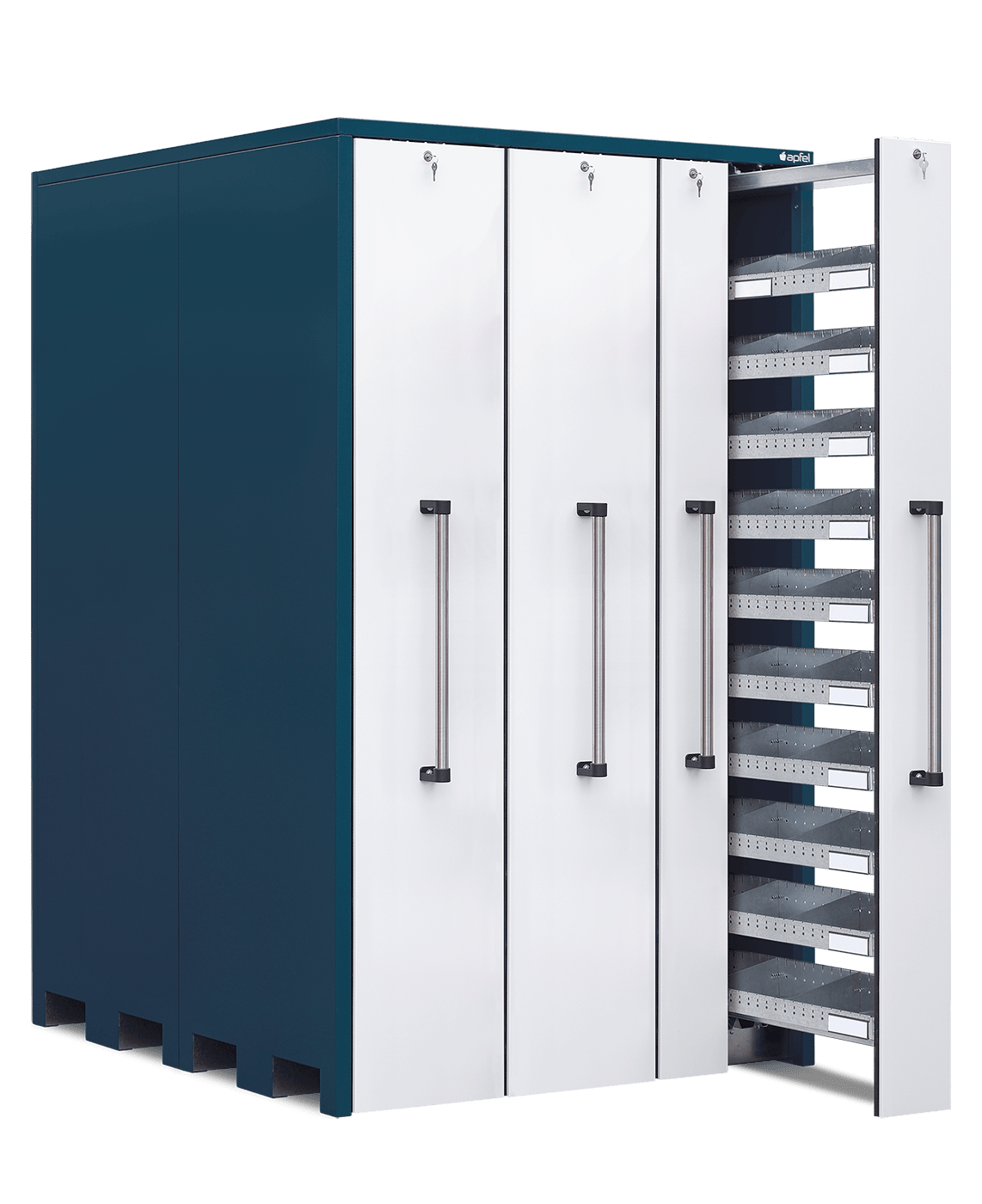 - Sichere und staubarme Lagerung: Mitlaufende Räder, beidseitige Gummilippen und einzeln abschließbare Auszüge schützen die gelagerten Artikel zuverlässig vor Staub und unbefugtem Zugriff.