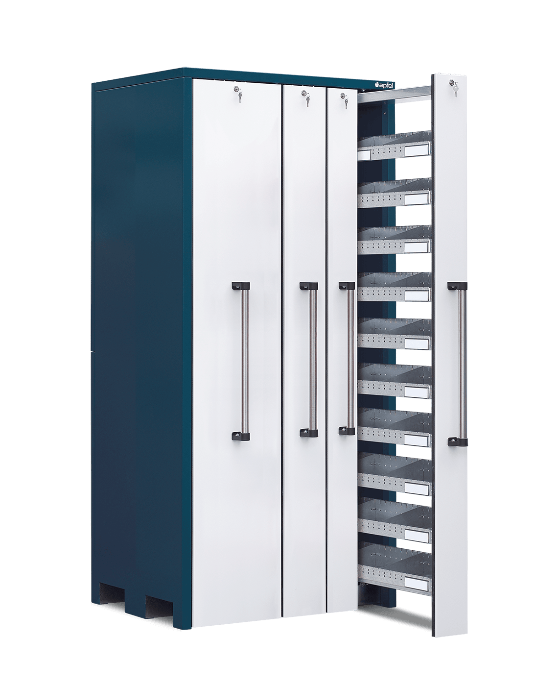 - Sichere und staubarme Lagerung: Mitlaufende Räder, beidseitige Gummilippen und abschließbare Auszüge schützen den Inhalt zuverlässig vor Staub und unbefugtem Zugriff.