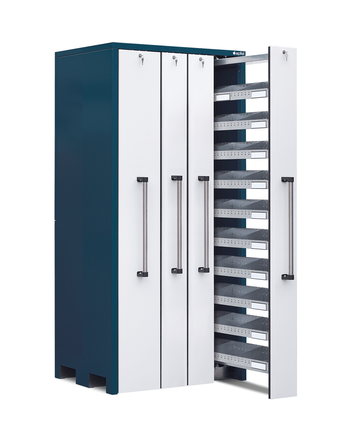 • Optimal zur übersichtlichen Lagerung von Schüttgut: Ein Vertikalauszug à 300 mm Breite und drei Vertikalauszüge à 200 mm Breite bieten Platz für insgesamt 40 Schüttgutwannen mit je zehn abgeschrägten Behältern.