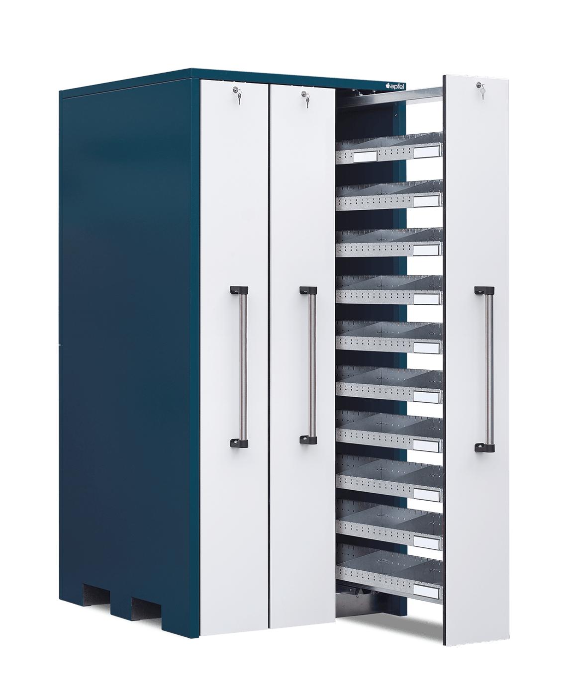 • Sichere und staubarme Lagerung: Mitlaufende Räder, beidseitige Gummilippen und einzeln abschließbare Auszüge schützen den Inhalt zuverlässig vor Staub und unbefugtem Zugriff.