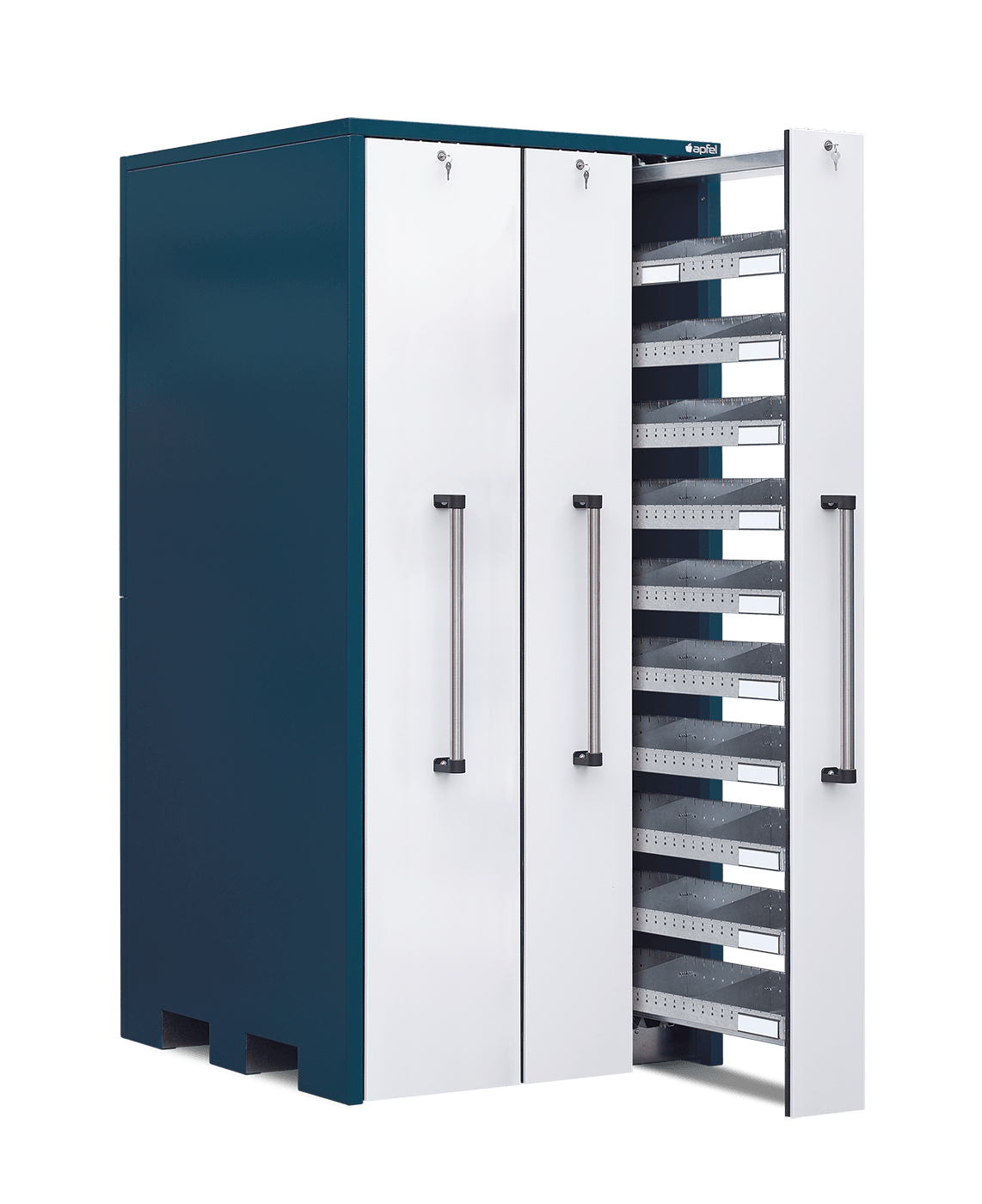 - Sichere und staubarme Lagerung: Mitlaufende Räder, beidseitige Gummilippen und einzeln abschließbare Auszüge schützen den Inhalt zuverlässig vor Staub und unbefugtem Zugriff.