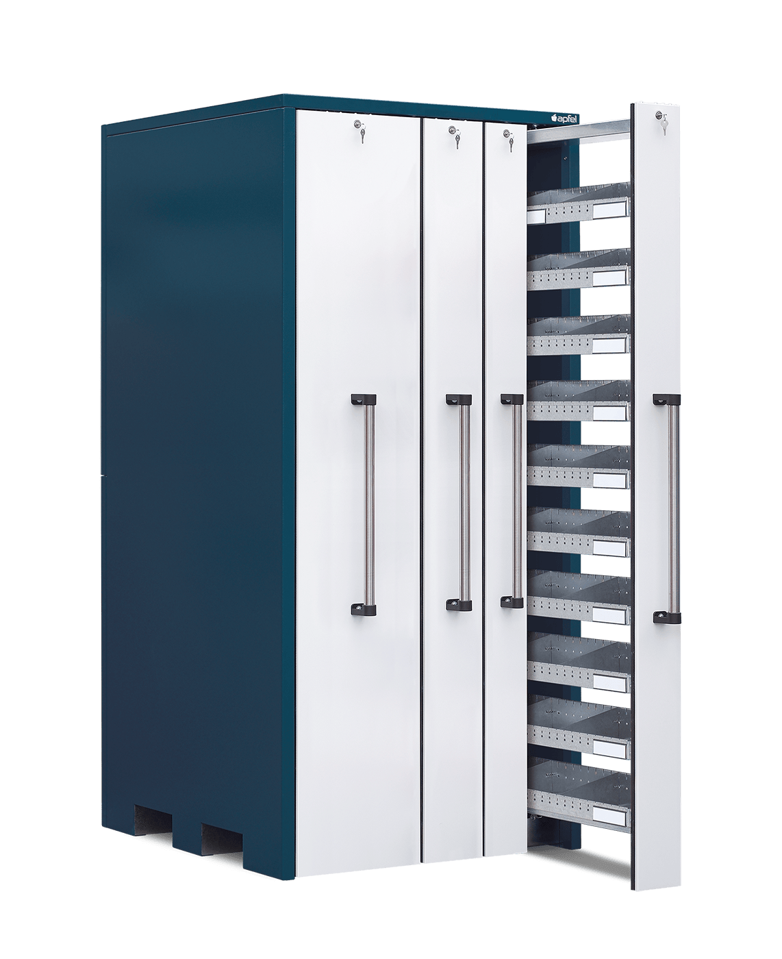 • Optimal zur übersichtlichen Lagerung von Schüttgut: Ein Vertikalauszug à 400 mm Breite, ein Vertikalauszug à 200 mm Breite und zwei Vertikalauszüge à 150 mm Breite bieten Platz für insgesamt 40 Schüttgutwannen mit je zehn abgeschrägten Behältern.