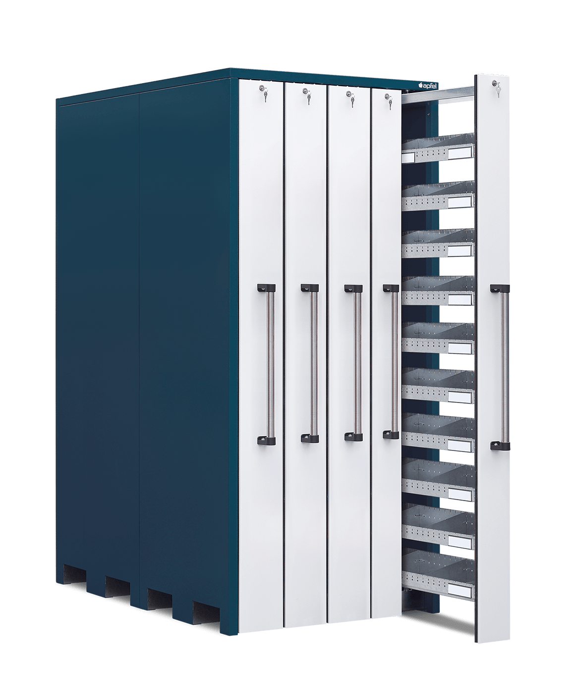- Sichere und staubarme Lagerung: Mitlaufende Räder, beidseitige Gummilippen und abschließbare Auszüge schützen die gelagerten Artikel zuverlässig vor Staub und unbefugtem Zugriff.