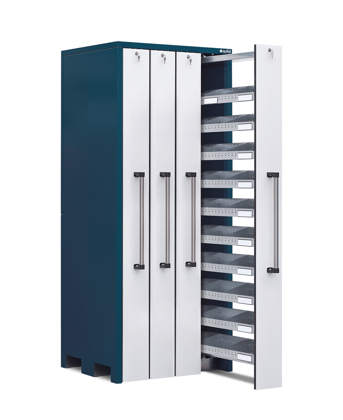 • Optimal zur übersichtlichen Lagerung von Schüttgut: Vier Vertikalauszüge à 200 mm Breite bieten Platz für 40 Schüttgutwannen mit je zehn abgeschrägten Behältern.