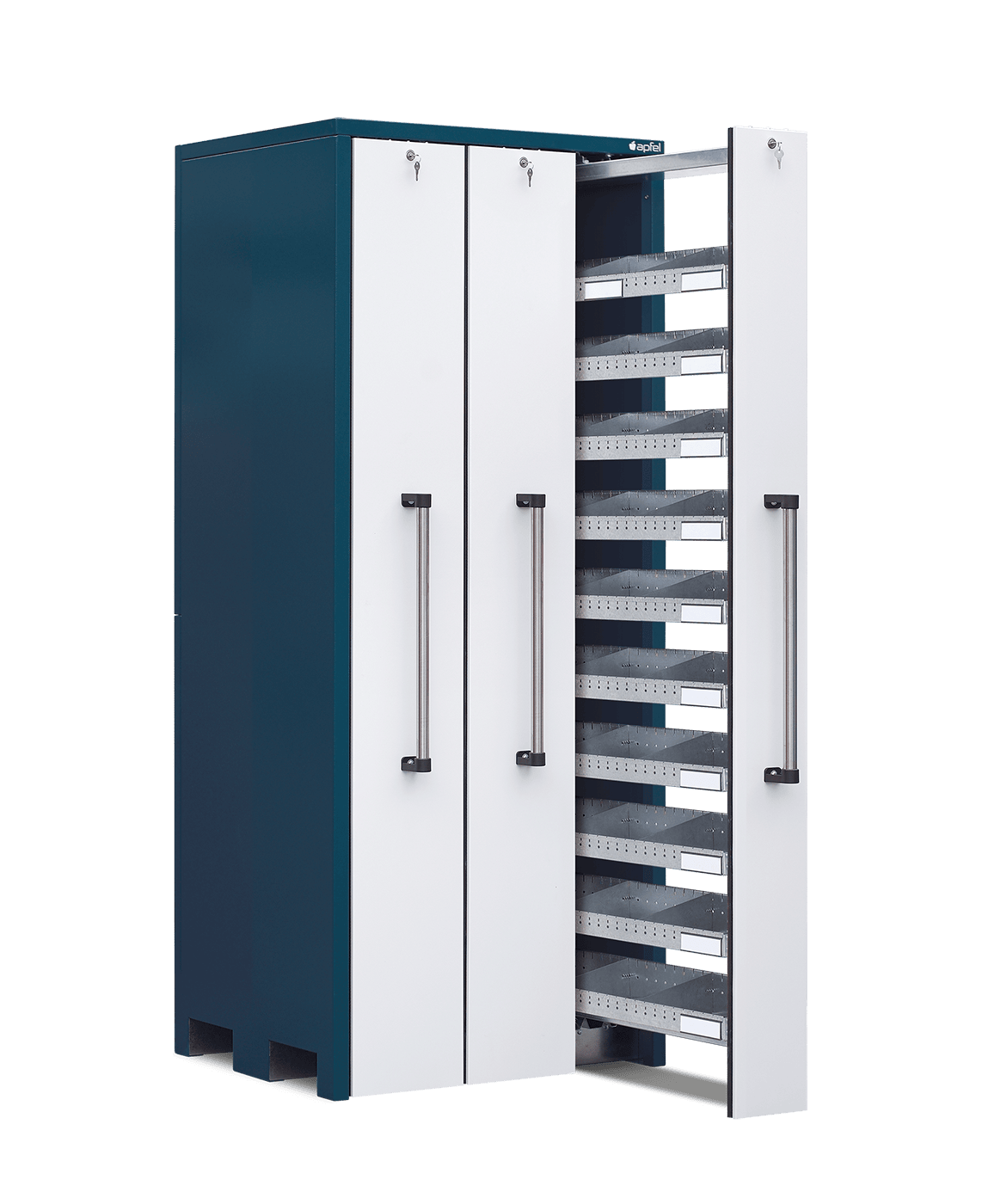 • Optimal zur übersichtlichen Lagerung von Schüttgut: Zwei Vertikalauszüge à 300 mm Breite und ein Vertikalauszug à 200 mm Breite bieten Platz für insgesamt 30 Schüttgutwannen mit je zehn abgeschrägten Behältern.
