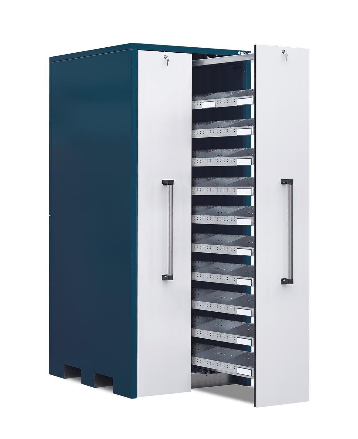 - Sichere und staubarme Lagerung: Mitlaufende Räder, beidseitige Gummilippen und einzeln abschließbare Auszüge schützen den Inhalt zuverlässig vor Staub und unbefugtem Zugriff.
