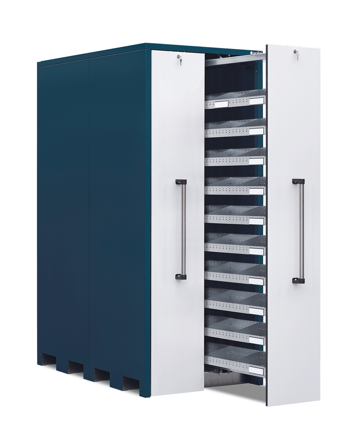 - Sichere und staubarme Lagerung: Mitlaufende Räder, beidseitige Gummilippen und einzeln abschließbare Auszüge schützen den Inhalt zuverlässig vor Staub und unbefugtem Zugriff.