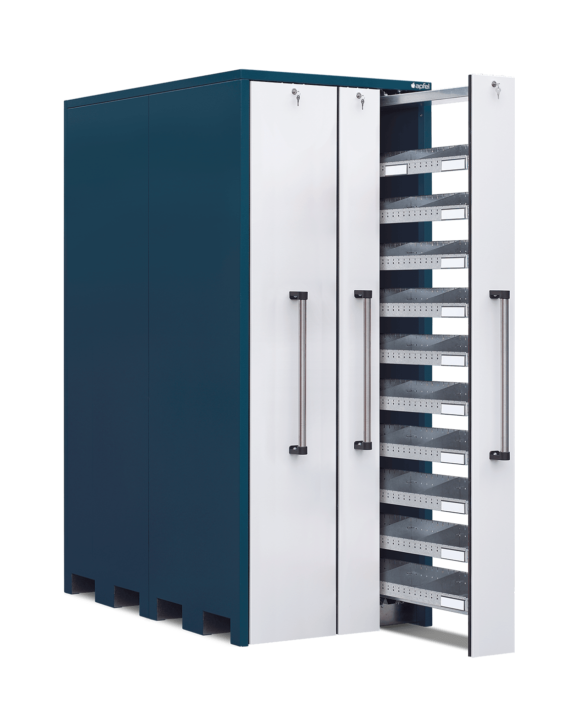 - Sichere und staubarme Lagerung: Mitlaufende Räder, beidseitige Gummilippen und einzeln abschließbare Auszüge schützen die gelagerten Artikel zuverlässig vor Staub und unbefugtem Zugriff.