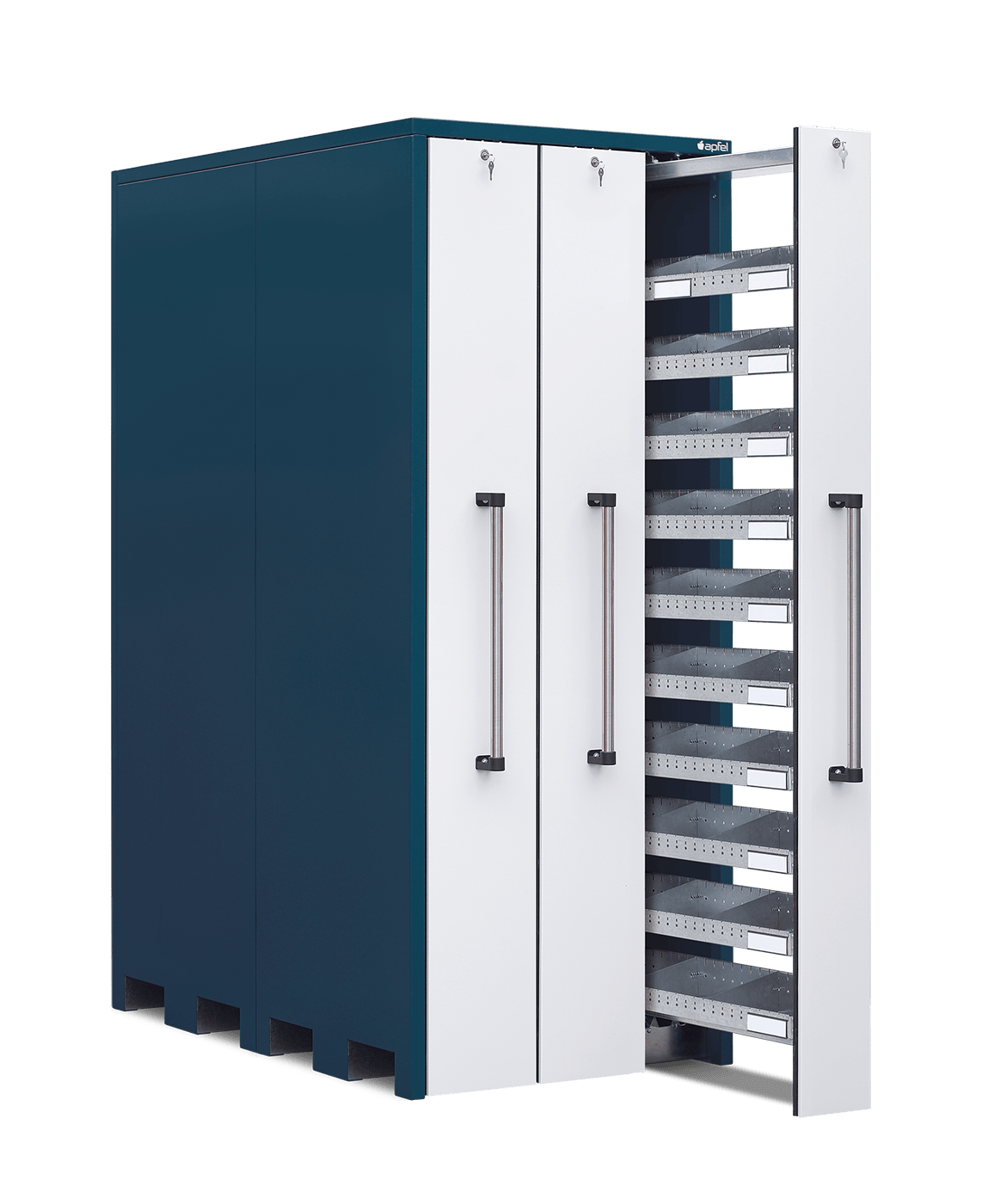 - Sichere und staubarme Lagerung: Mitlaufende Räder, beidseitige Gummilippen und einzeln abschließbare Auszüge schützen die gelagerten Artikel zuverlässig vor Staub und unbefugtem Zugriff.