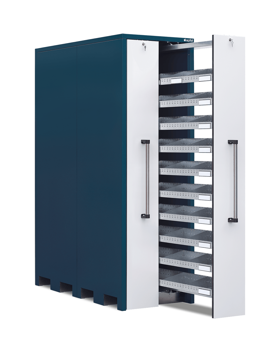 - Sichere und staubarme Lagerung: Mitlaufende Räder, beidseitige Gummilippen und abschließbare Auszüge schützen die gelagerten Artikel zuverlässig vor Staub und unbefugtem Zugriff.