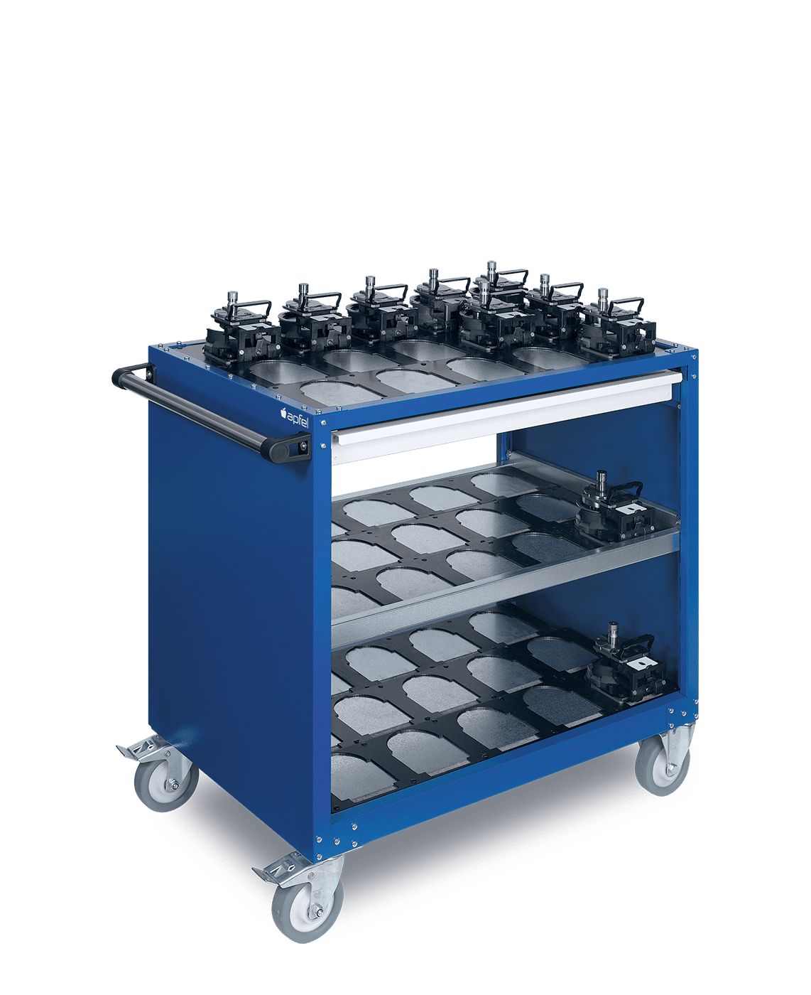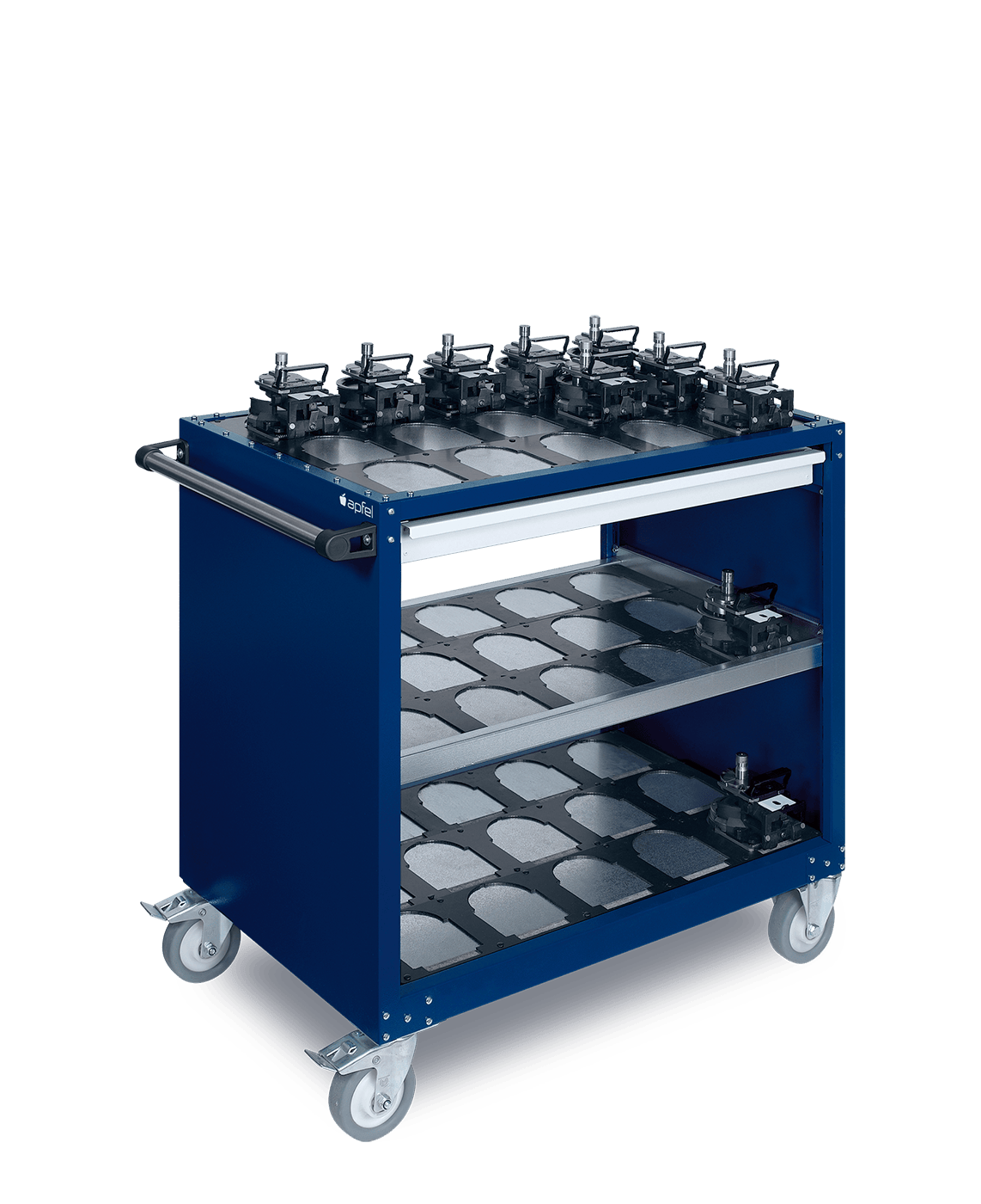 Der WSW 581 Stanzen ist ein stabiler Werkstattwagen für die sichere und übersichtliche Aufbewahrung von Stanzwerkzeugen und Rüstkassetten. Neun Werkzeugträger mit ölbindender Filzeinlage schützen das Werkzeug und sorgen für Ordnung im Arbeitsalltag.