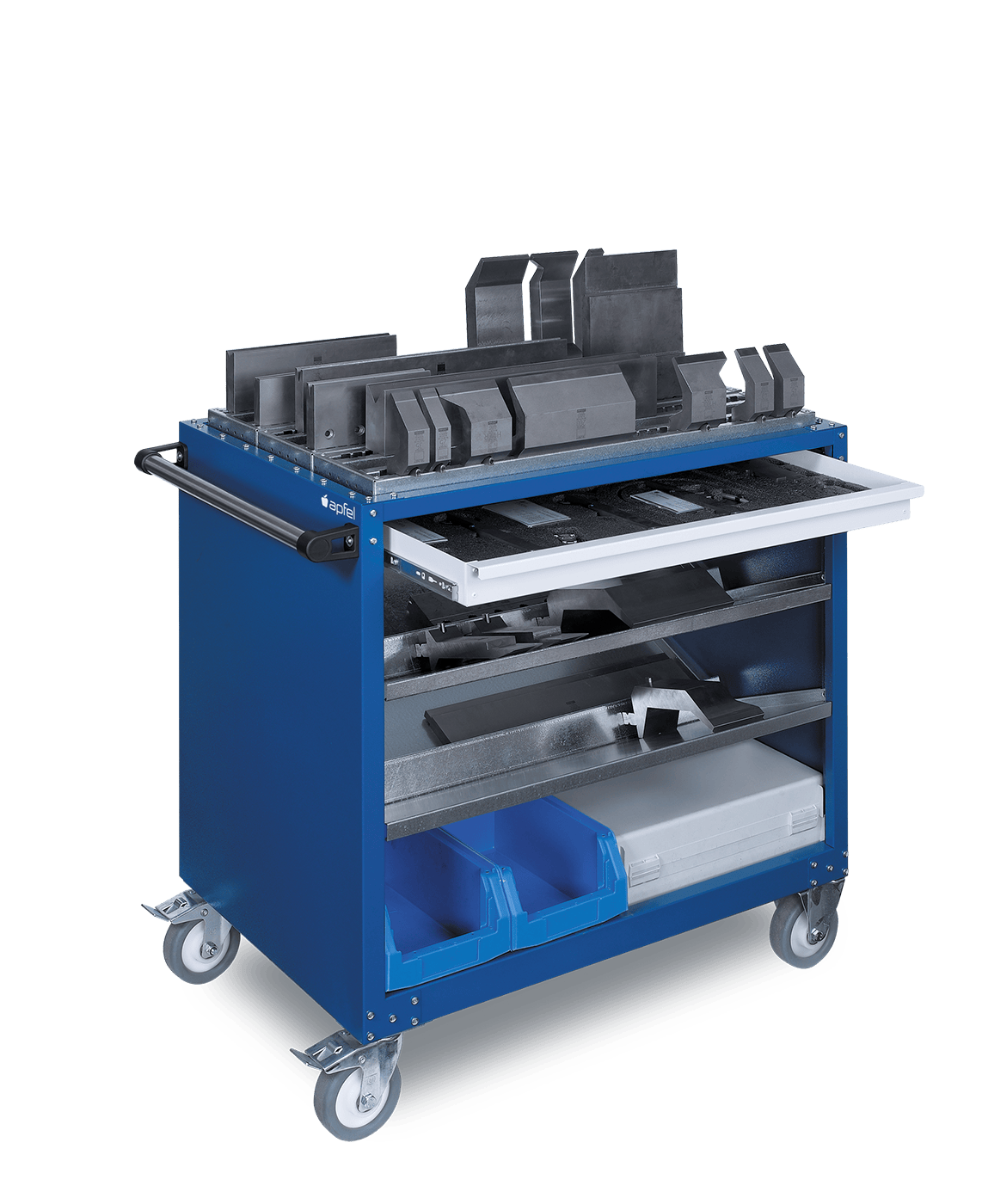 Der WSW 583 Abkanten plus ist ein besonders stabiler Werkstattwagen für die sichere und übersichtliche Lagerung von Abkantwerkzeugen. Mit zwei abgeschrägten Fachböden und einem Mitteltrenner lassen sich Werkzeuge ergonomisch und geordnet entnehmen. Drei zusätzliche Werkzeugträger mit ölbindender Filzeinlage schützen die Werkzeuge und halten die Ablage sauber.