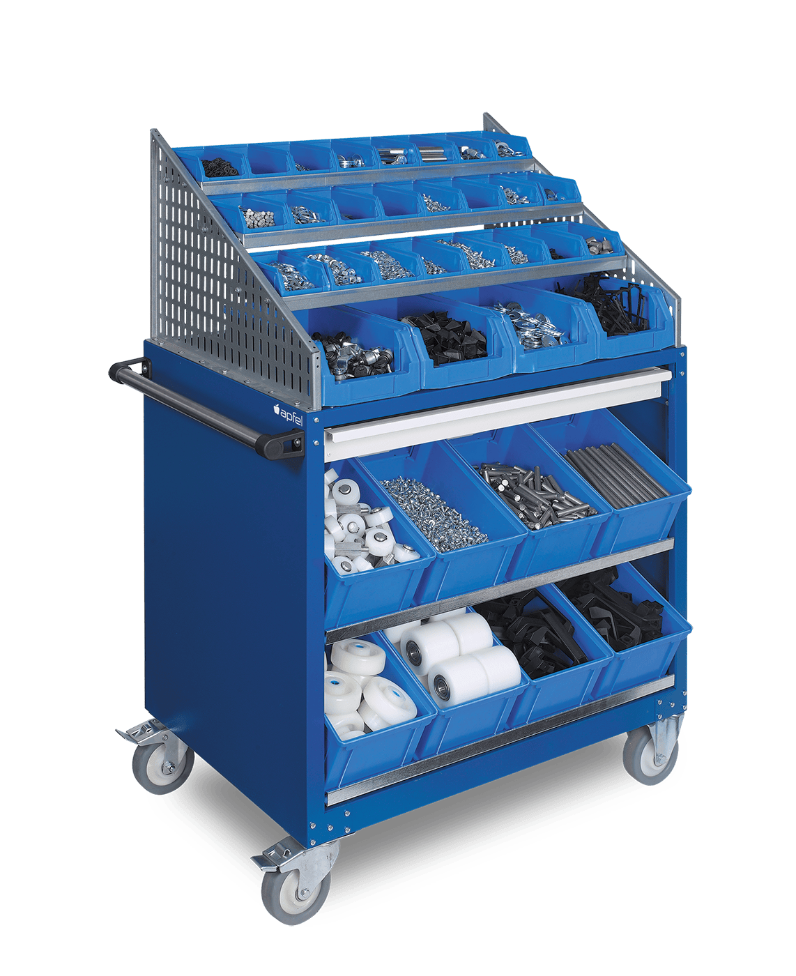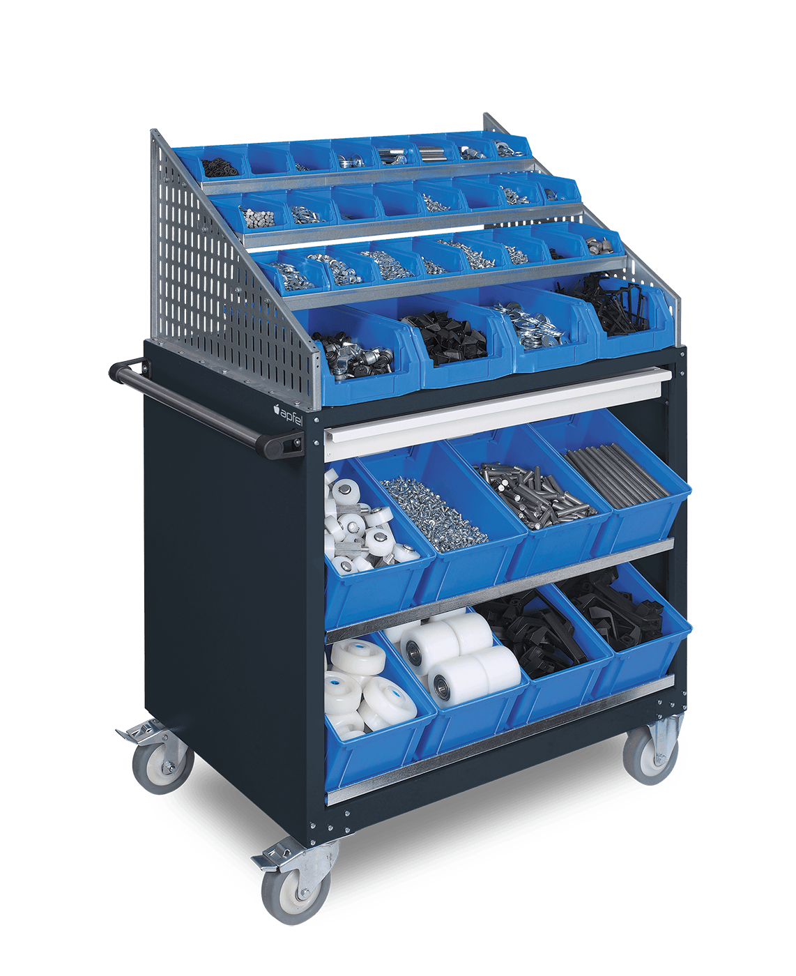 Der WSW 586 Kommissionieren ist ein vielseitiger Werkstattwagen für die strukturierte Lagerung und Bereitstellung von Kleinteilen. Er wird komplett montiert geliefert und ist mit einem Trapezaufsatz, zwei abgeschrägten Fachböden, drei schmalen Fachböden sowie einem beidseitig montierbaren Auszug ausgestattet.