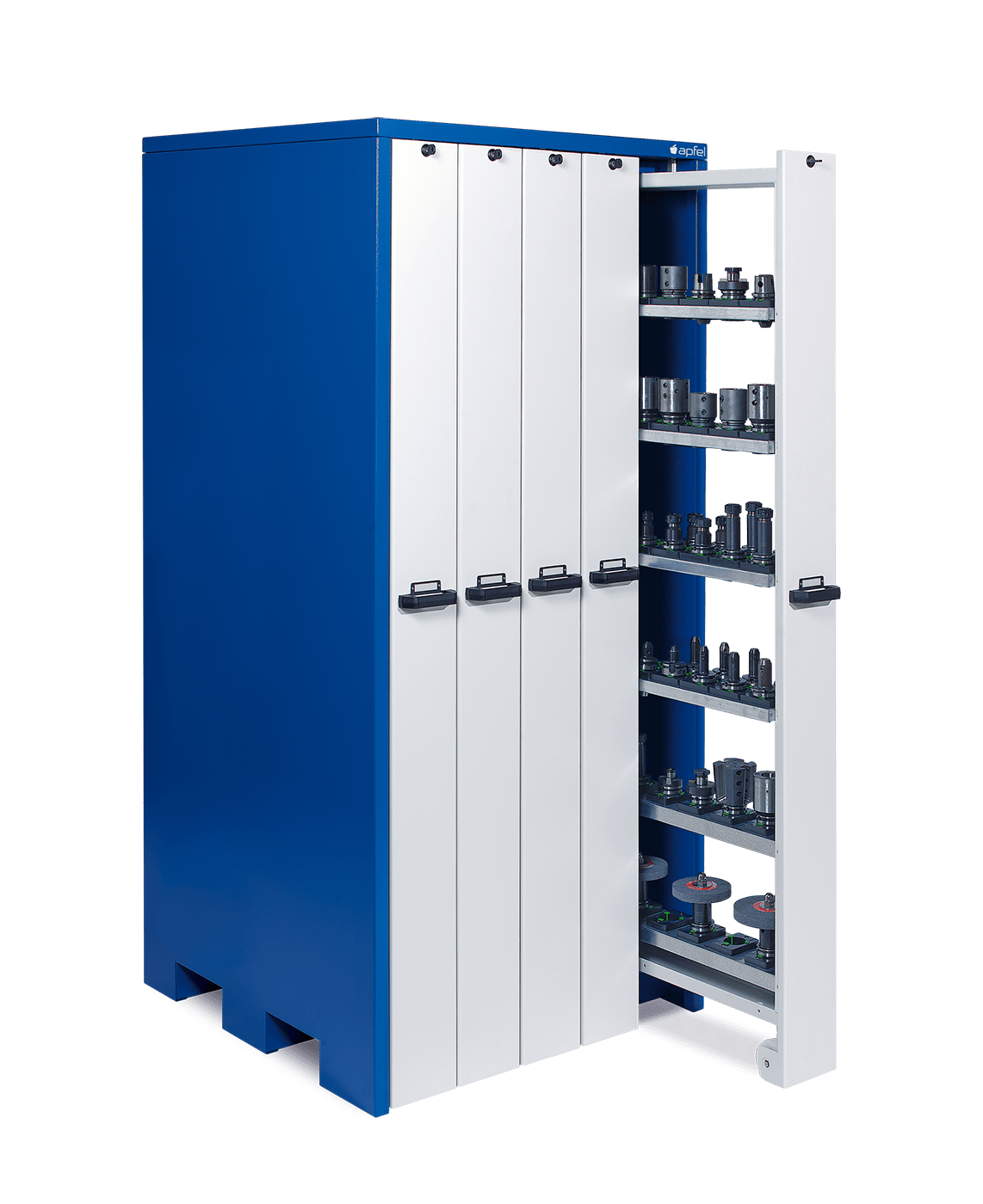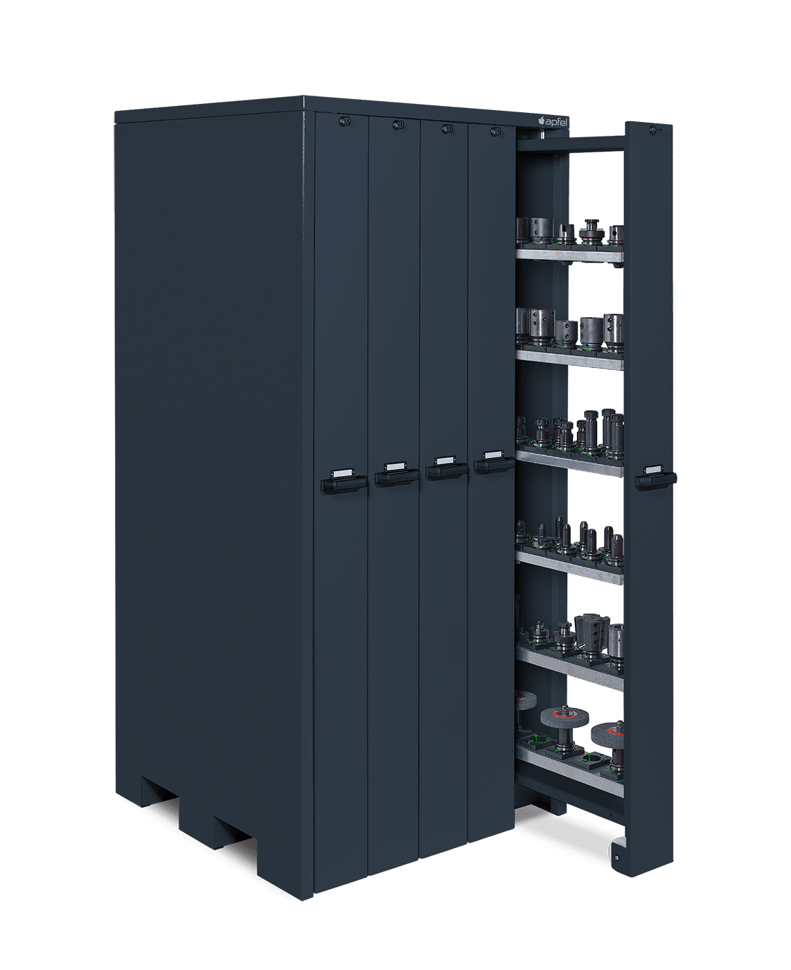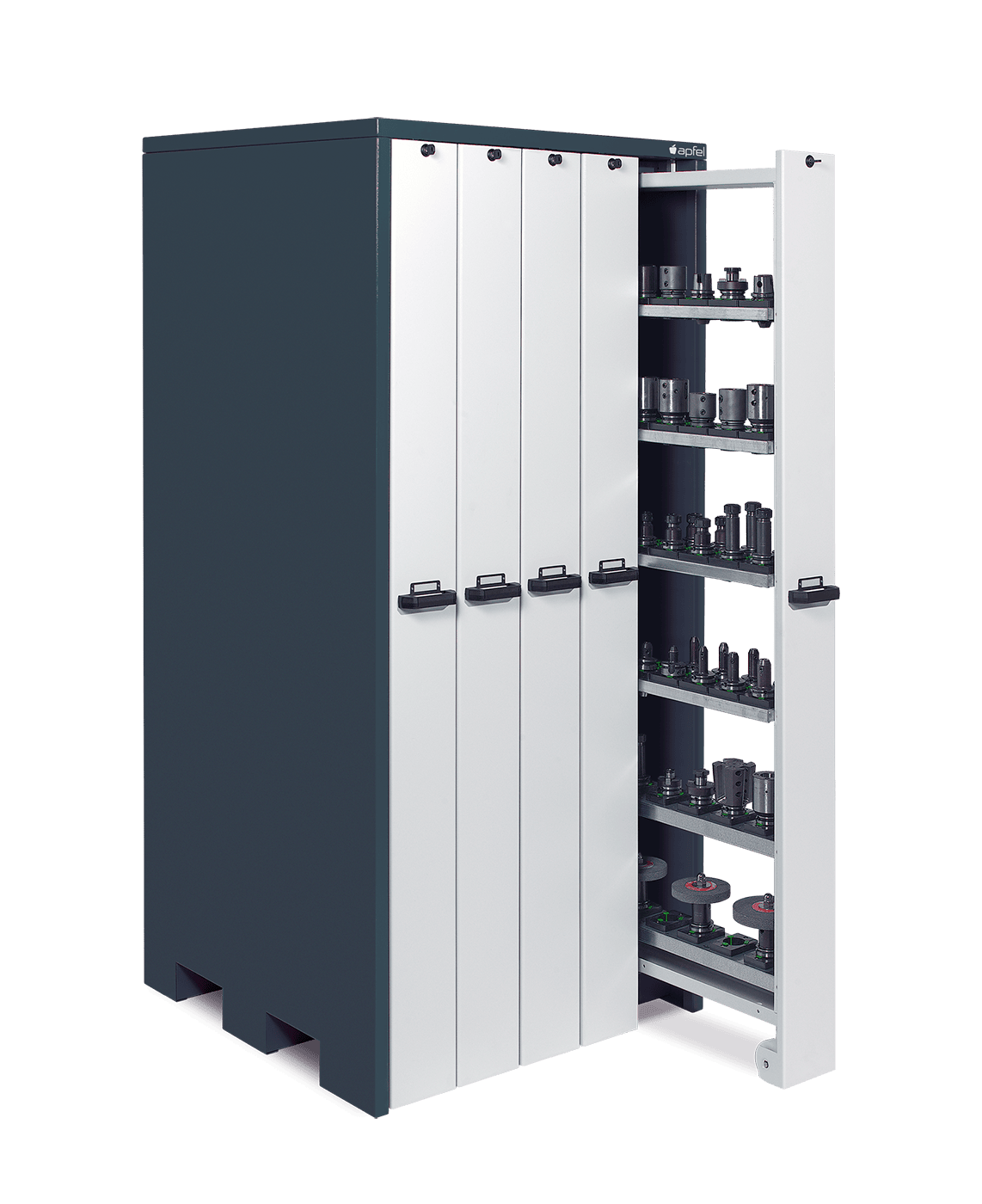 - Platzsparende Lagerung für alle gängigen Werkzeugtypen: Mit Maßen von 2.140 mm Höhe, 1.040 mm Breite und 1.050 mm Tiefe bietet der Schrank die perfekte Lösung für bis zu 480 Werkzeuge – optimal für SK, HSK, VDI, ABS und Capto.