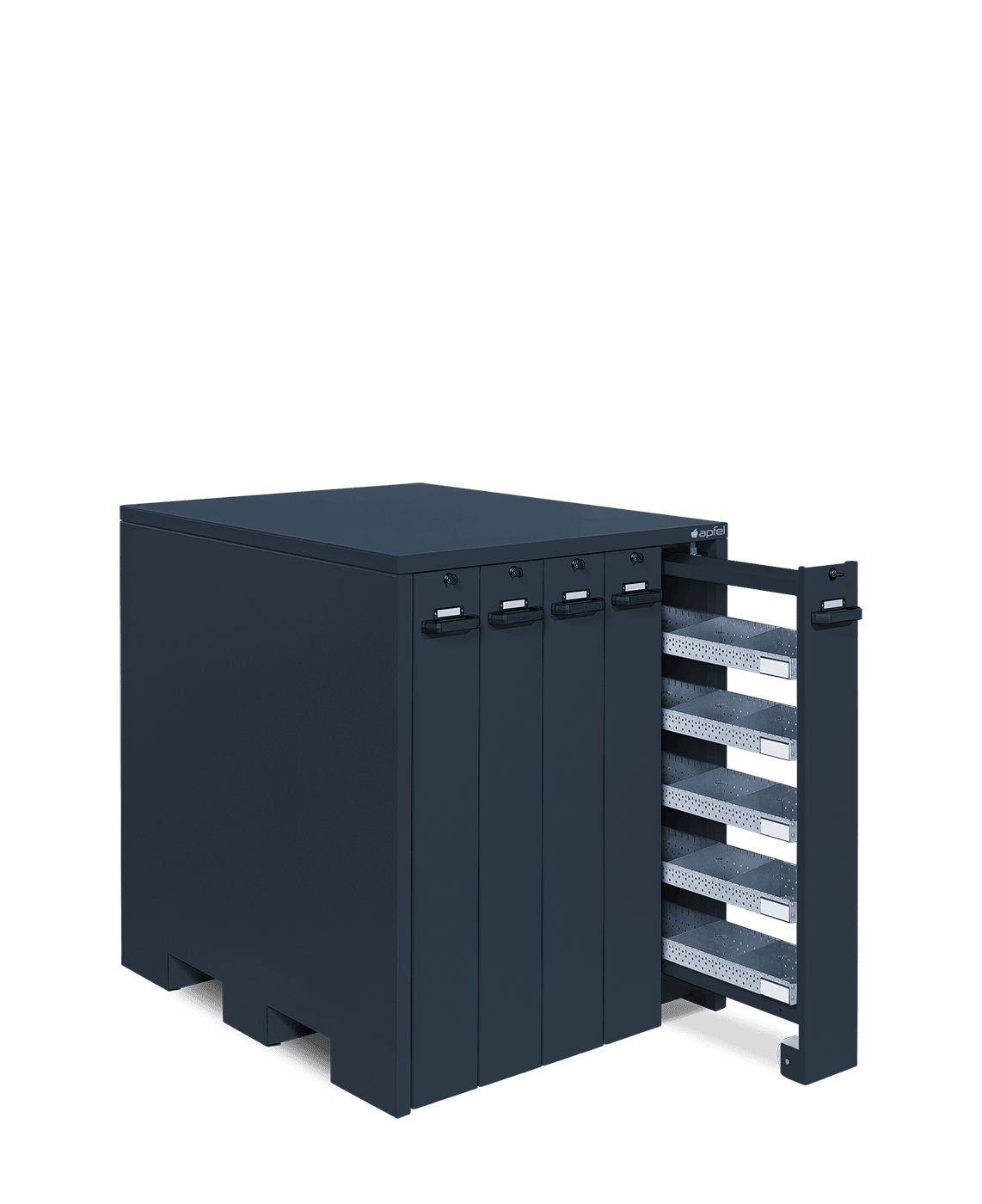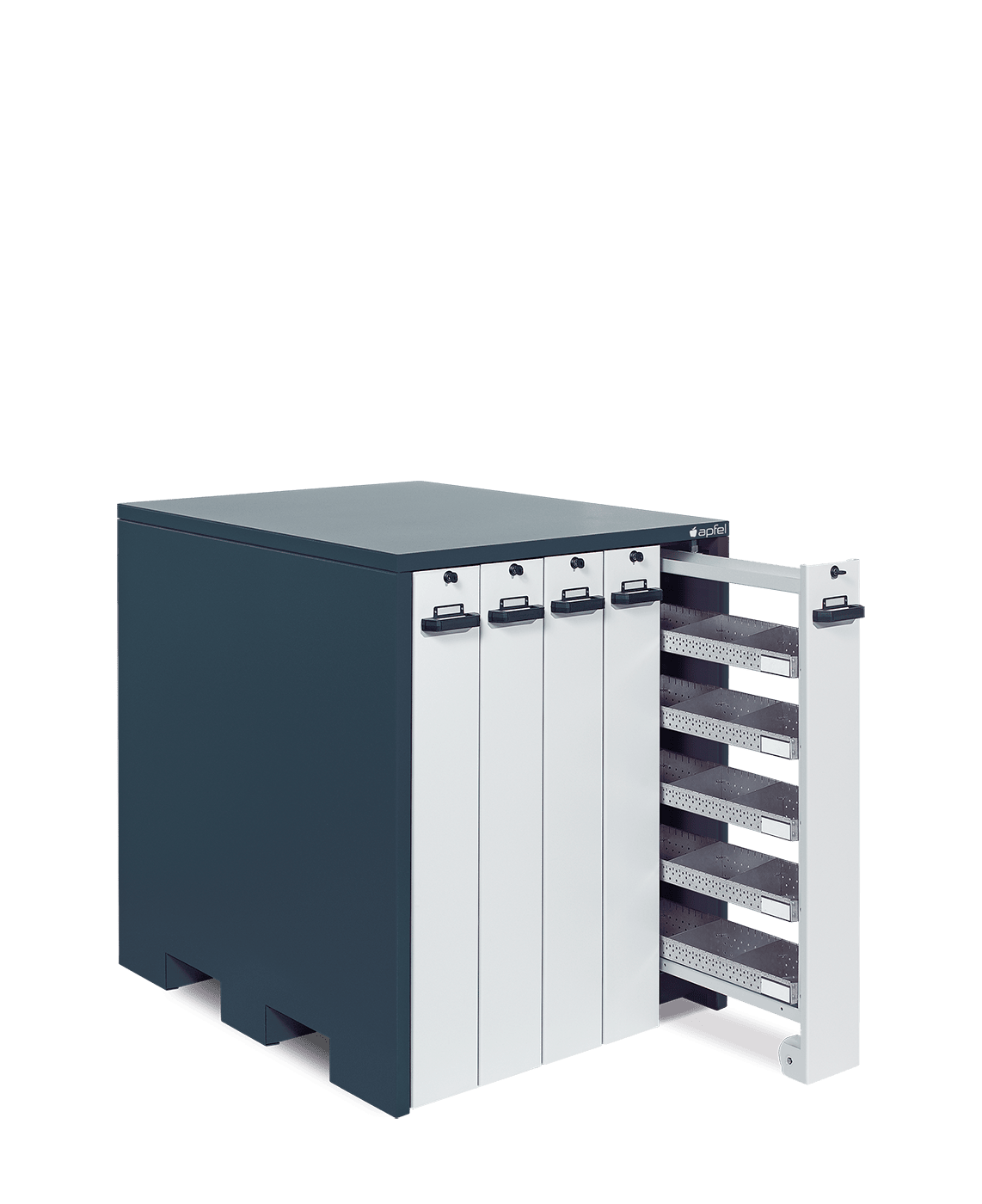 - Sicher und mobil: Jeder Auszug ist einzeln abschließbar und schützt wertvolle Bestände vor unbefugtem Zugriff. Mitlaufende Räder und die Verfahrbarkeit per Hubwagen ermöglichen einen einfachen Standortwechsel.