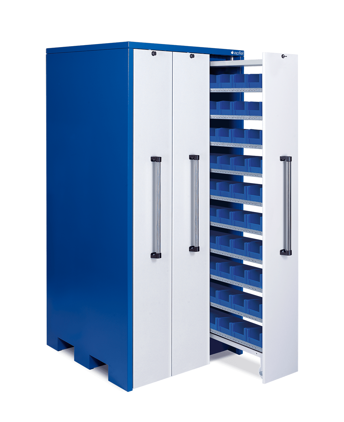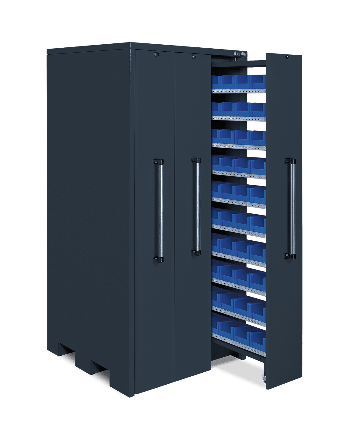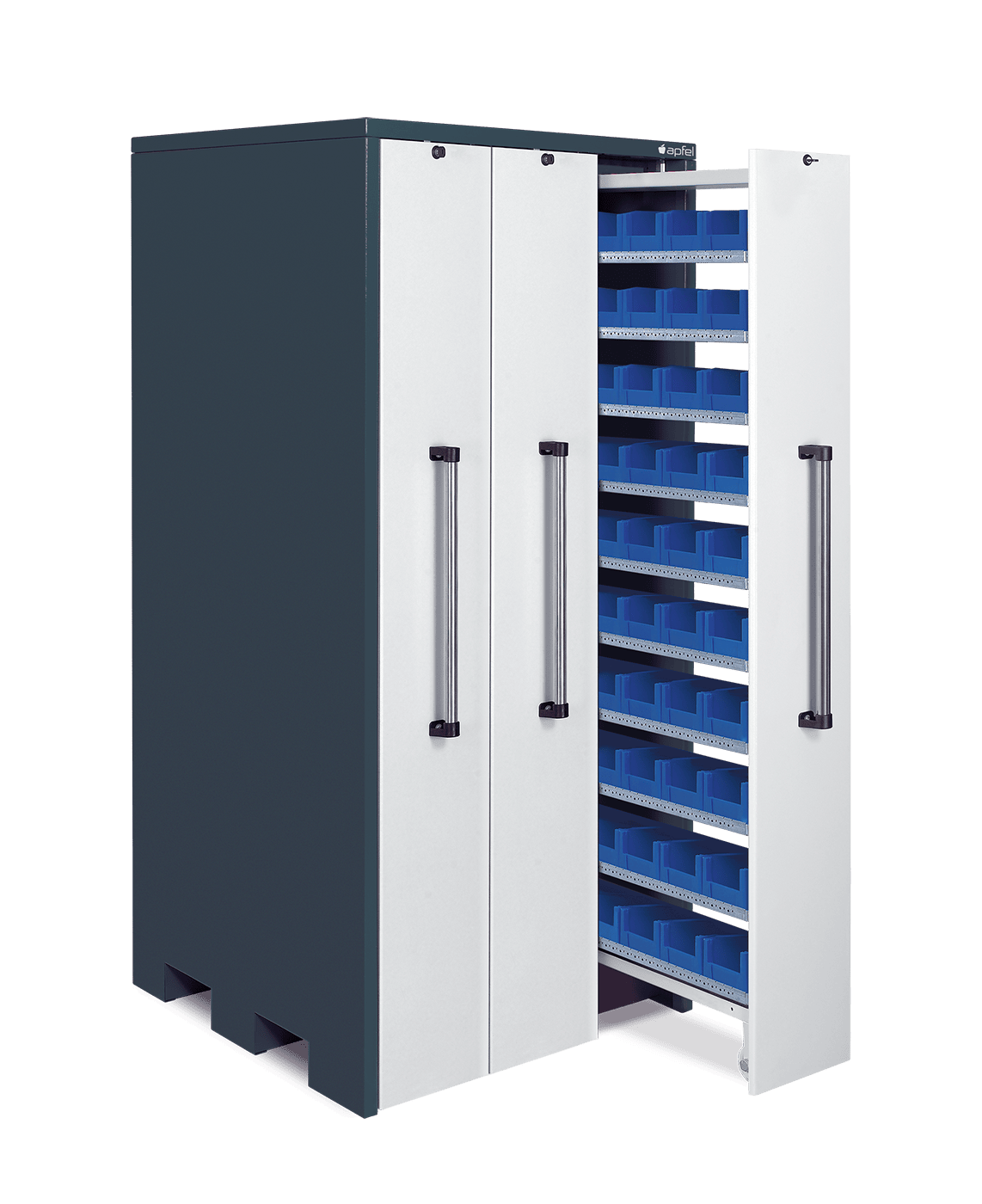 • Platzsparende Lagerung für große Artikel: Mit Maßen von 2.140 mm Höhe, 1.040 mm Breite und 1.050 mm Tiefe lagert der Schrank Hunderte von Schrauben, Normteilen und C-Artikeln strukturiert auf minimaler Fläche.
