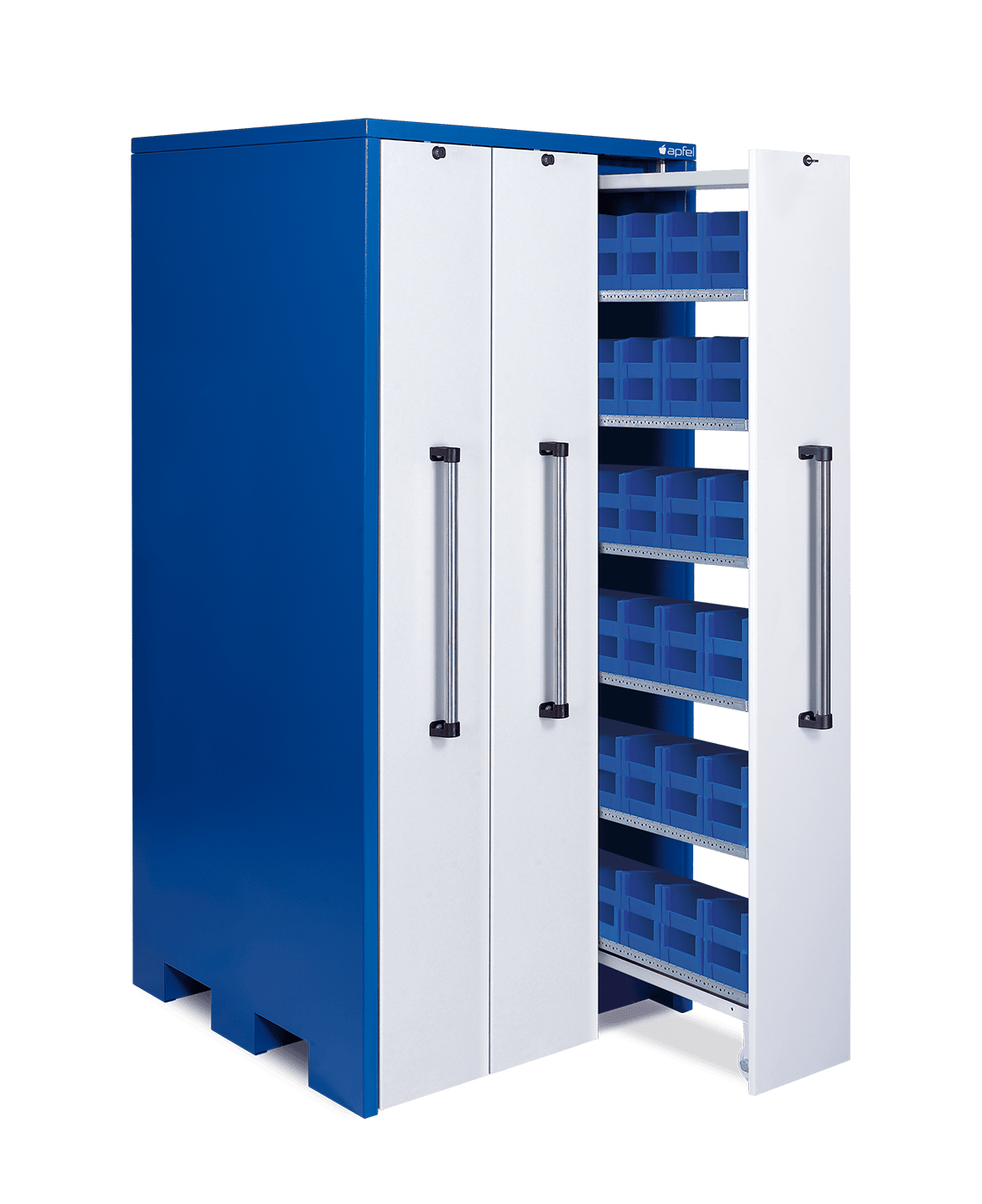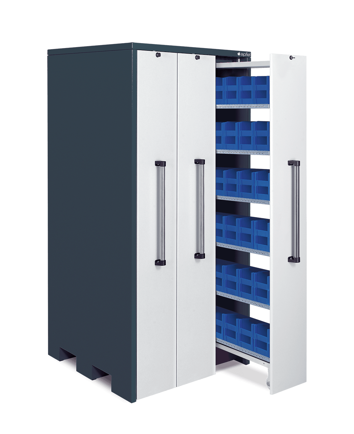 • Sicher und mobil: Jeder Auszug ist einzeln abschließbar und schützt wertvolle Bestände vor unbefugtem Zugriff. Mitlaufende Räder und die Verfahrbarkeit per Hubwagen ermöglichen einen einfachen Standortwechsel.