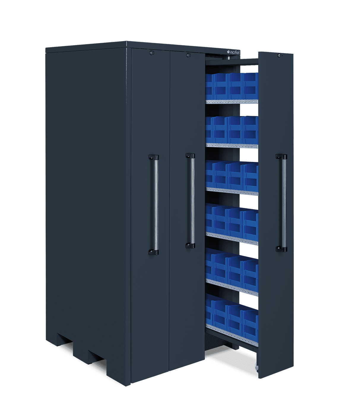Der WKS 004 Set L plus wurde speziell für die strukturierte und sichere Kanban-Lagerung von schweren und voluminösen Artikeln entwickelt. Mit drei Vertikalauszügen à 300 mm Breite und jeweils 1.800 kg Tragkraft lagert der Schrank auch große Mengen an Bauteilen oder C-Artikeln auf geringster Fläche. Insgesamt 18 Lagerwannen WKH 903 und 216 Lagerkästen KLF 5 sorgen für klare Struktur und optimale Übersichtlichkeit. Die pulverbeschichtete Stahlkonstruktion in Enzianblau (RAL 5010) für den Korpus und Grauweiß (RAL 9002) für die Auszüge steht für Langlebigkeit und hochwertige Optik. Die Schrankmaße betragen 1.040 mm Breite, 2.140 mm Höhe und 1.050 mm Tiefe, das Leergewicht liegt bei 525 kg. Zur Serienausstattung gehören mitlaufende Räder, Verfahrbarkeit per Hubwagen, abschließbare Auszüge und ein integrierter Komforteinzug.