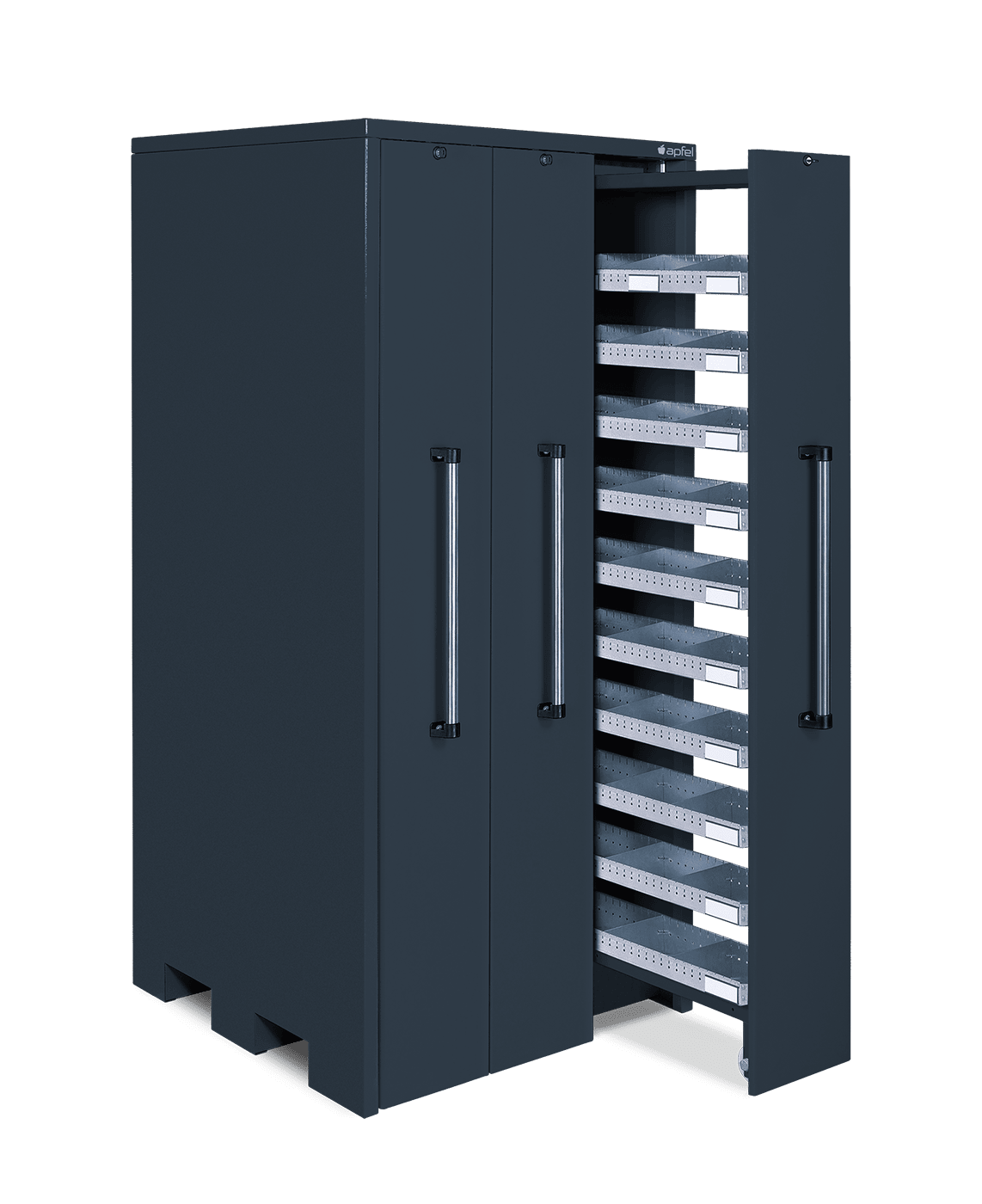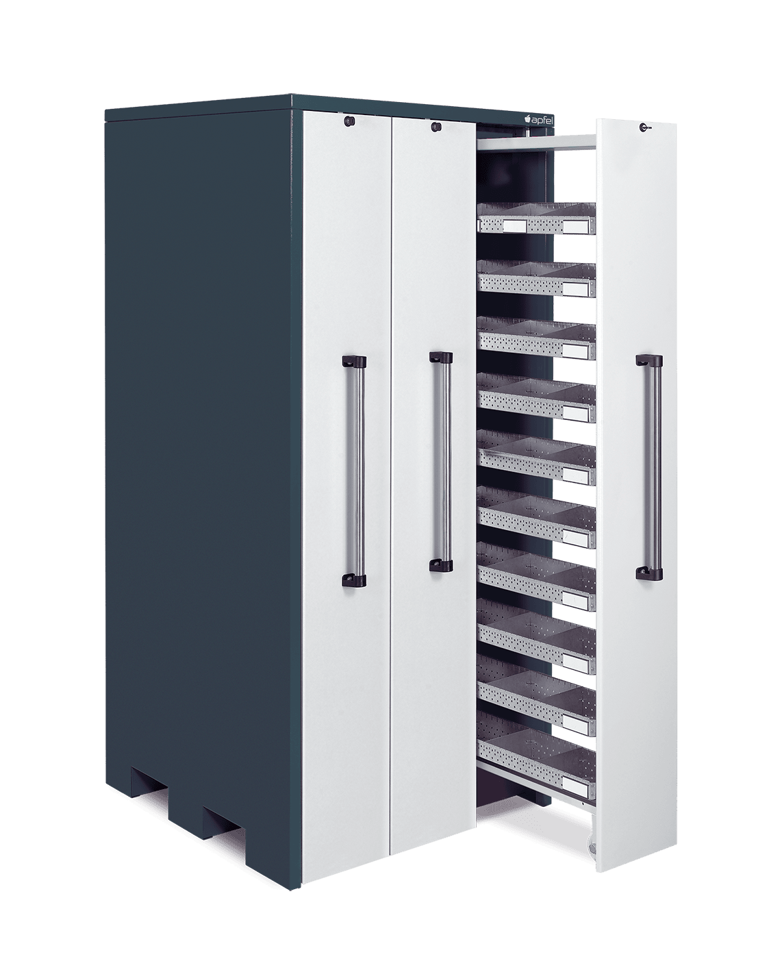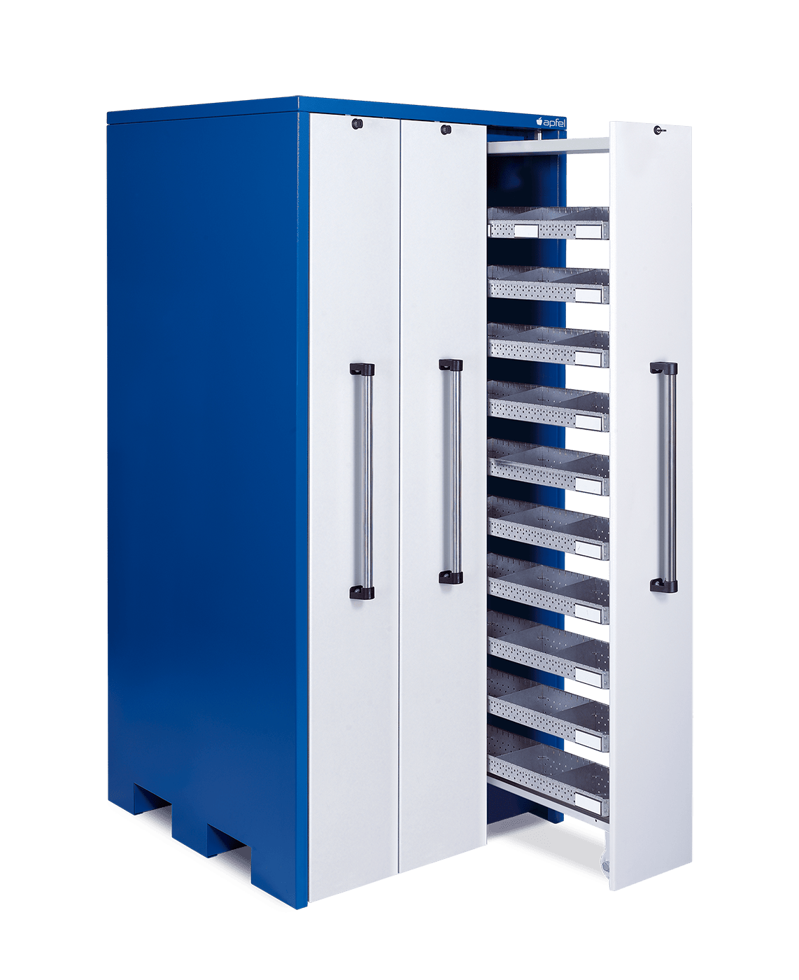 • Sicher und mobil: Jeder Auszug ist einzeln abschließbar und schützt wertvolle Bestände vor unbefugtem Zugriff. Mitlaufende Räder und die Verfahrbarkeit per Hubwagen ermöglichen einen einfachen Standortwechsel.