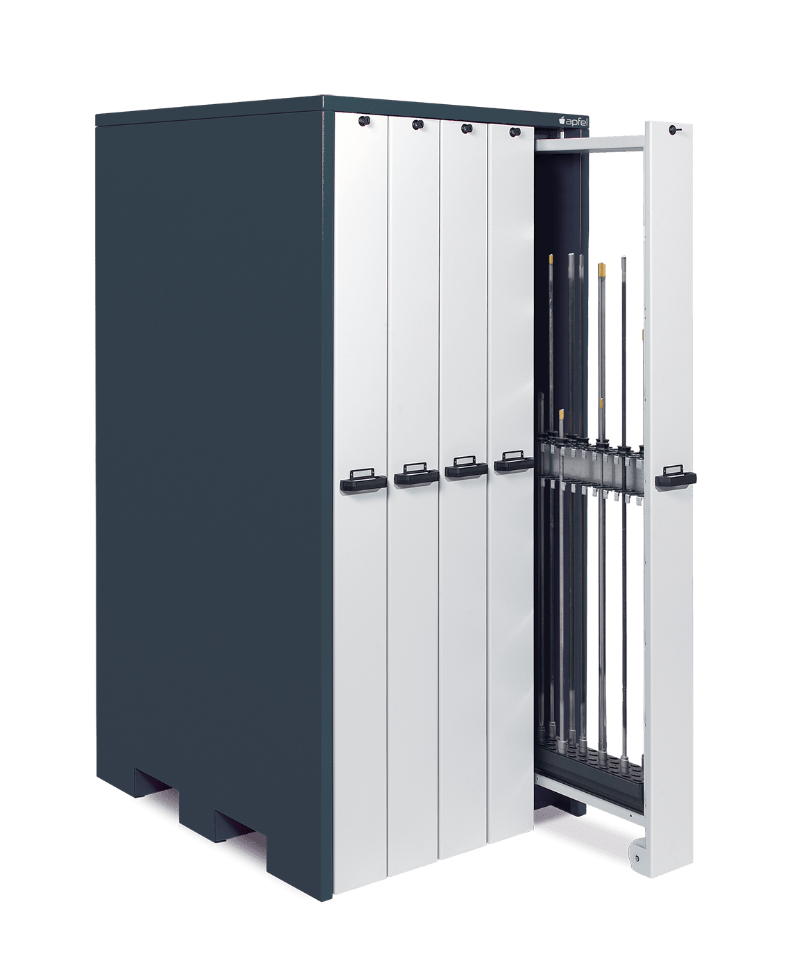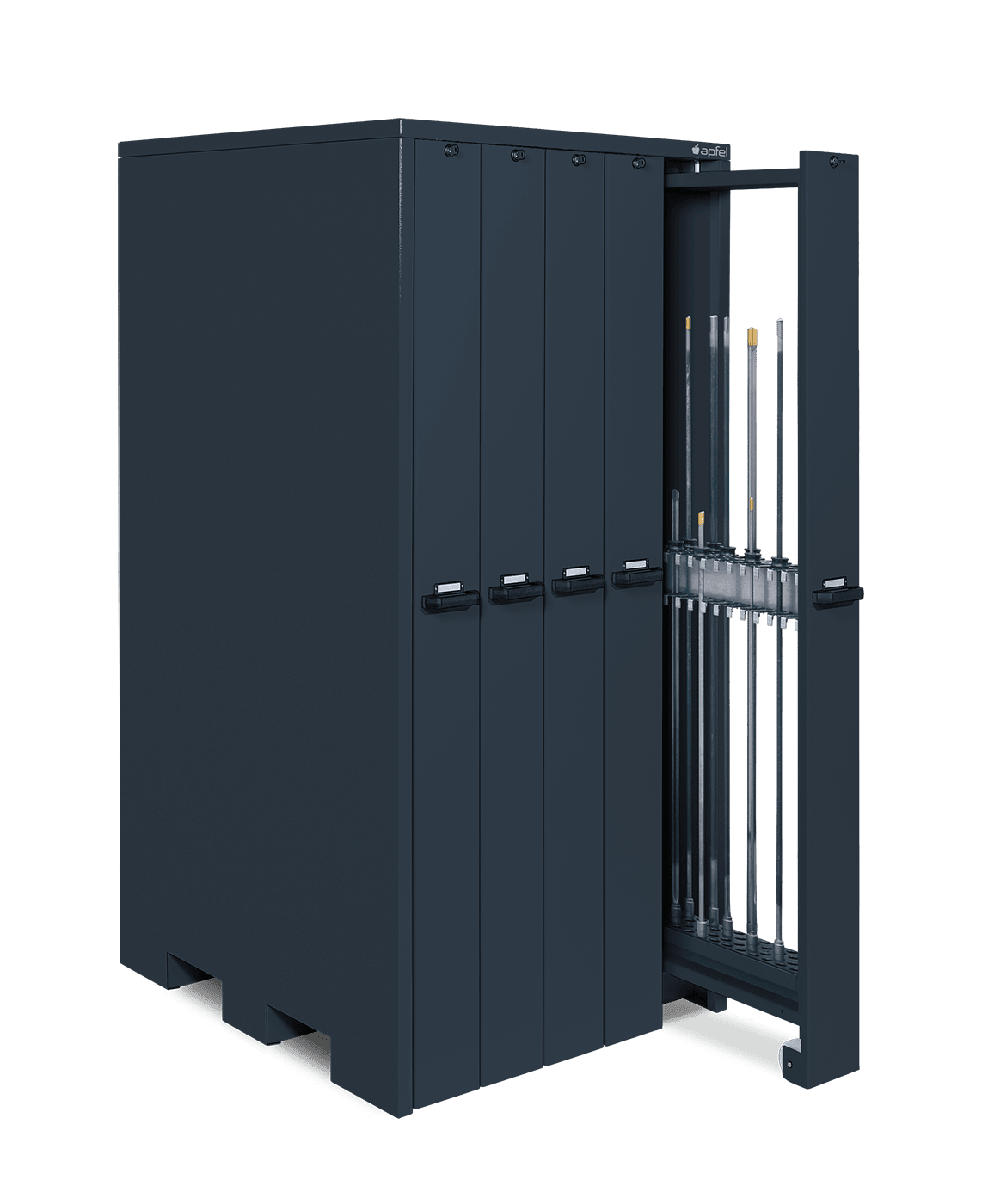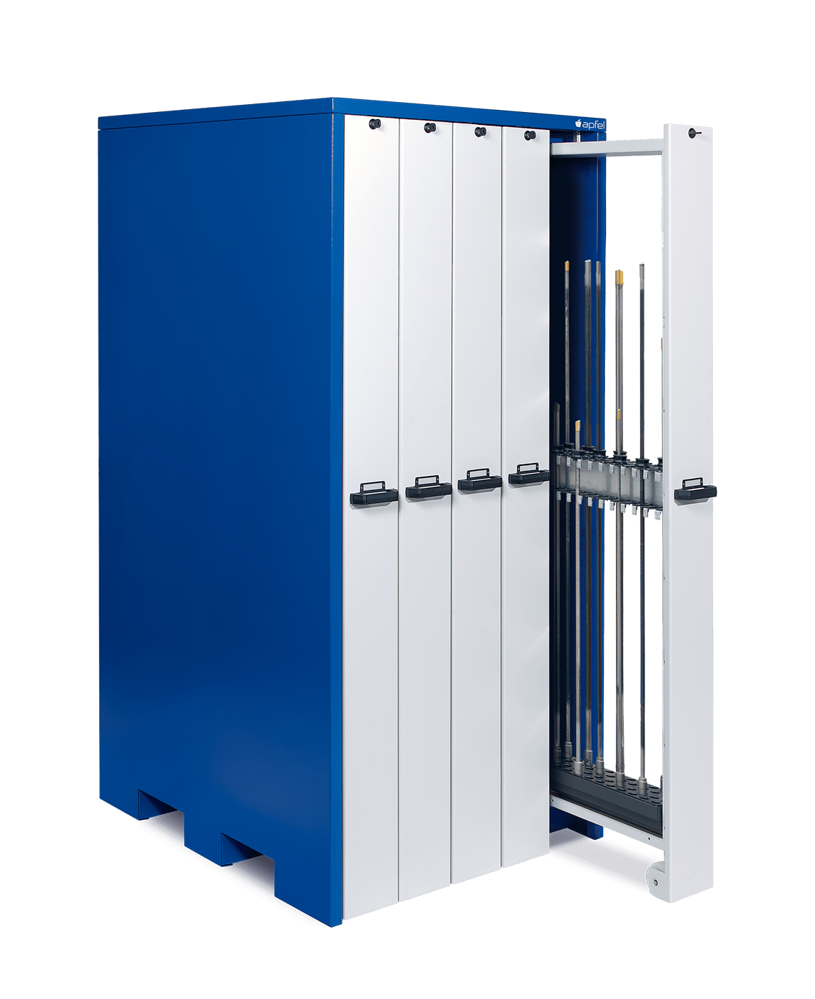 - Platzsparende Lagerung für Tieflochbohrer: Mit Maßen von 2.140 mm Höhe, 1.040 mm Breite und 1.300 mm Tiefe nutzt der Schrank die Grundfläche optimal aus und bietet dank erhöhter Tiefe Stauraum für bis zu 520 Tieflochbohrer.