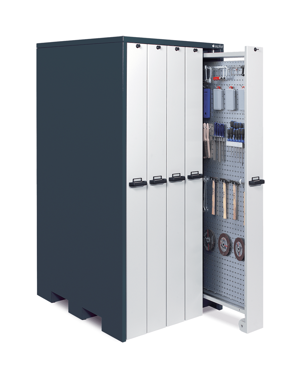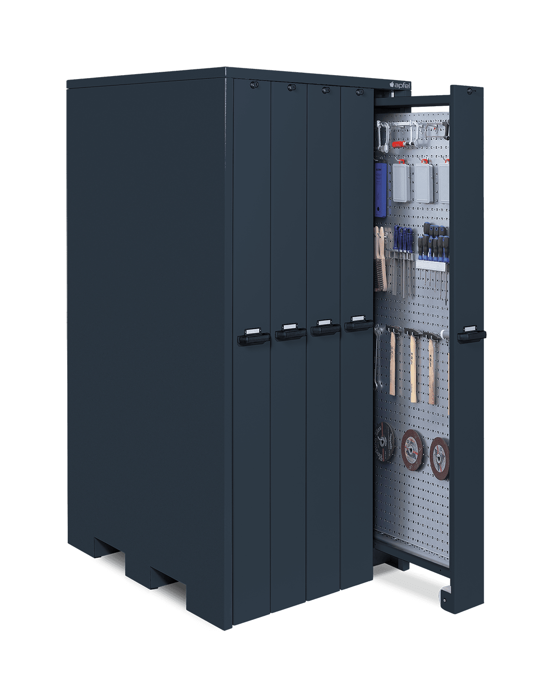 • Platzsparende Lagerung auf ca. 20 m² Lochwandfläche: Mit Maßen von 2.140 mm Höhe, 1.040 mm Breite und 1.300 mm Tiefe lagert der Schrank eine große Menge Werkzeuge und Betriebsmittel übersichtlich und griffbereit auf minimaler Grundfläche.