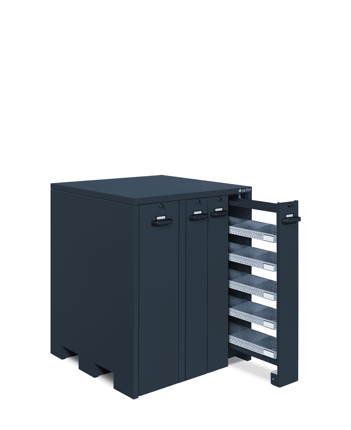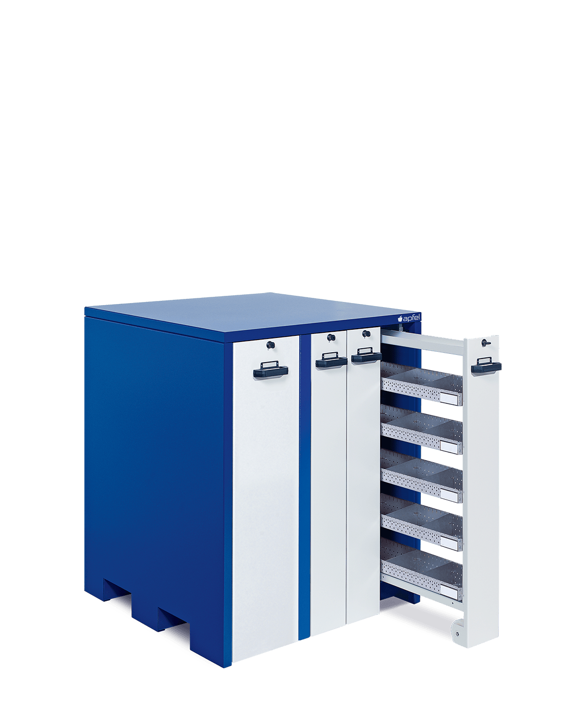 • Sicher und mobil: Jeder Auszug ist einzeln abschließbar und schützt wertvolle Bestände vor unbefugtem Zugriff. Mitlaufende Räder und die Verfahrbarkeit per Hubwagen ermöglichen einen einfachen Standortwechsel.