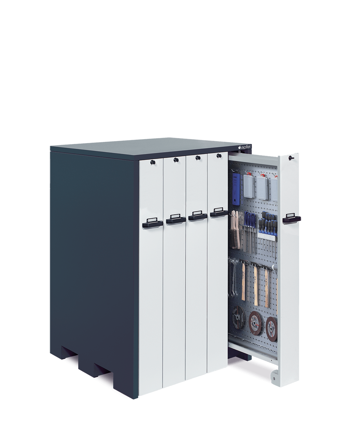Der WKS 015 Set K – Der kombinierte Lochwandschrank mit zwei Auszugsbreiten für unterschiedlich dimensionierte Werkzeuge