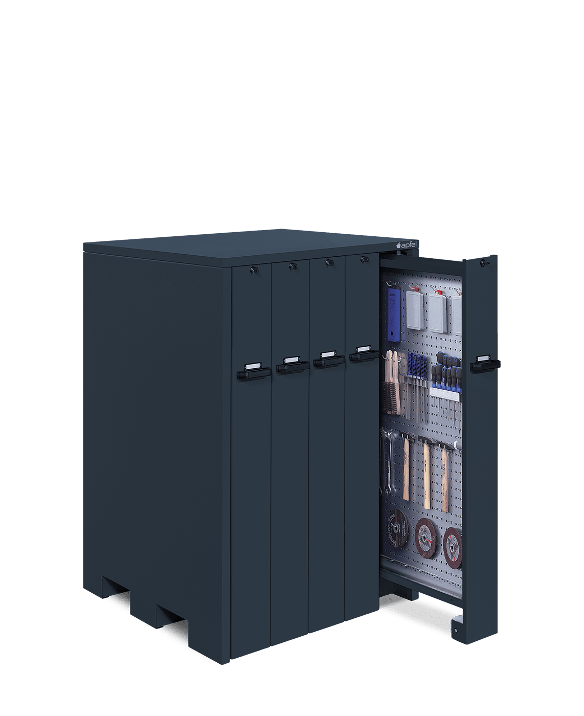 - Platzsparende Lagerung auf ca. 13 m² Lochwandfläche: Mit Maßen von 2.140 mm Höhe, 1.040 mm Breite und 1.050 mm Tiefe lagert der Schrank große Mengen an Werkzeugen und Betriebsmitteln übersichtlich und griffbereit.