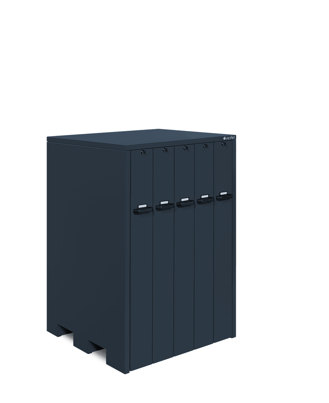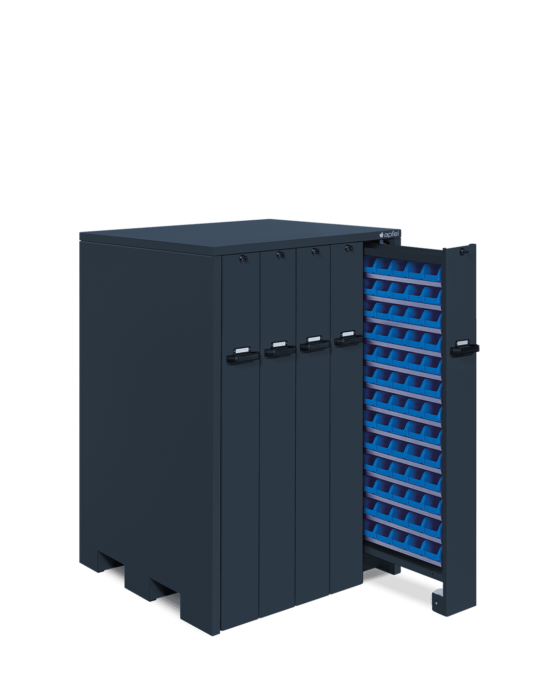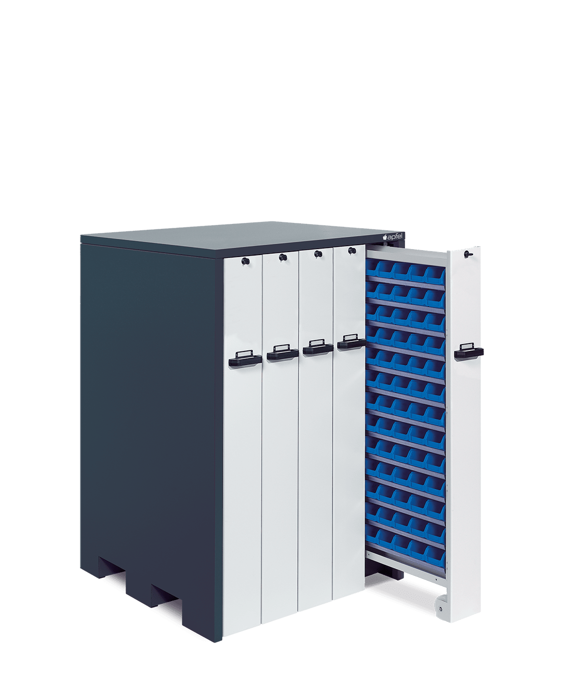 • Platzsparende Lagerung für viele verschiedene Artikel: Mit Maßen von 1.620 mm Höhe, 1.040 mm Breite und 1.050 mm Tiefe lagert der Schrank bis zu 520 Kästen strukturiert und griffbereit auf kleiner Fläche.