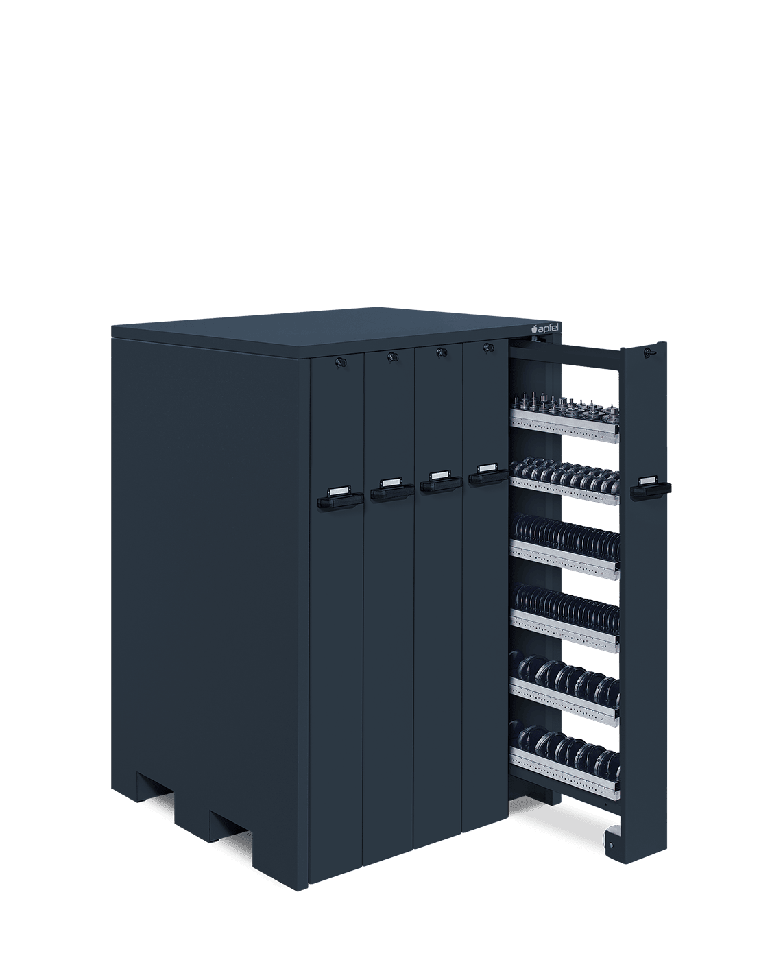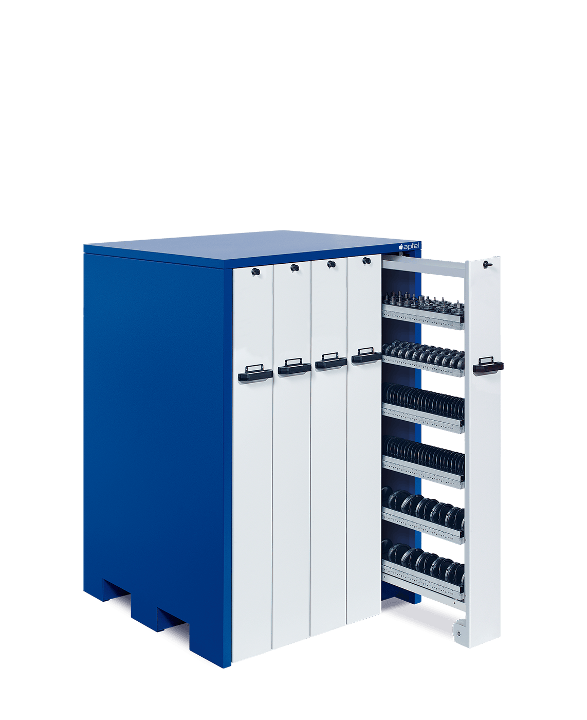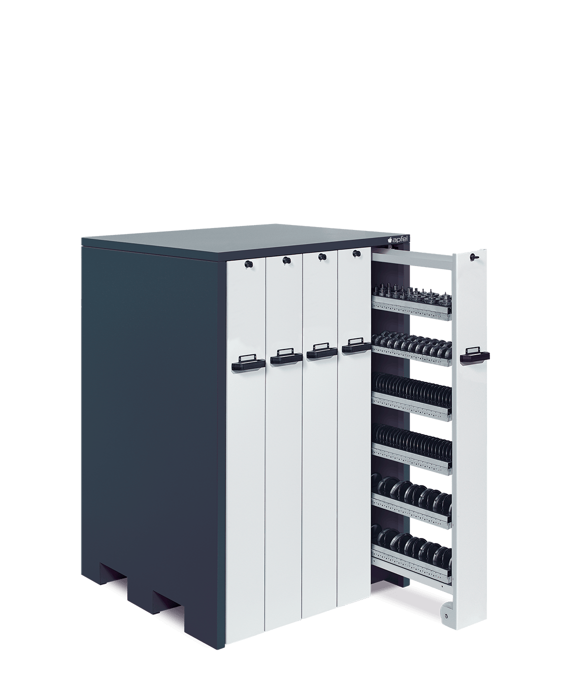 - Sicher und mobil: Jeder Auszug ist einzeln abschließbar und schützt wertvolle Stanzwerkzeuge vor unbefugtem Zugriff. Mitlaufende Räder und die Verfahrbarkeit per Hubwagen ermöglichen einen einfachen Standortwechsel.