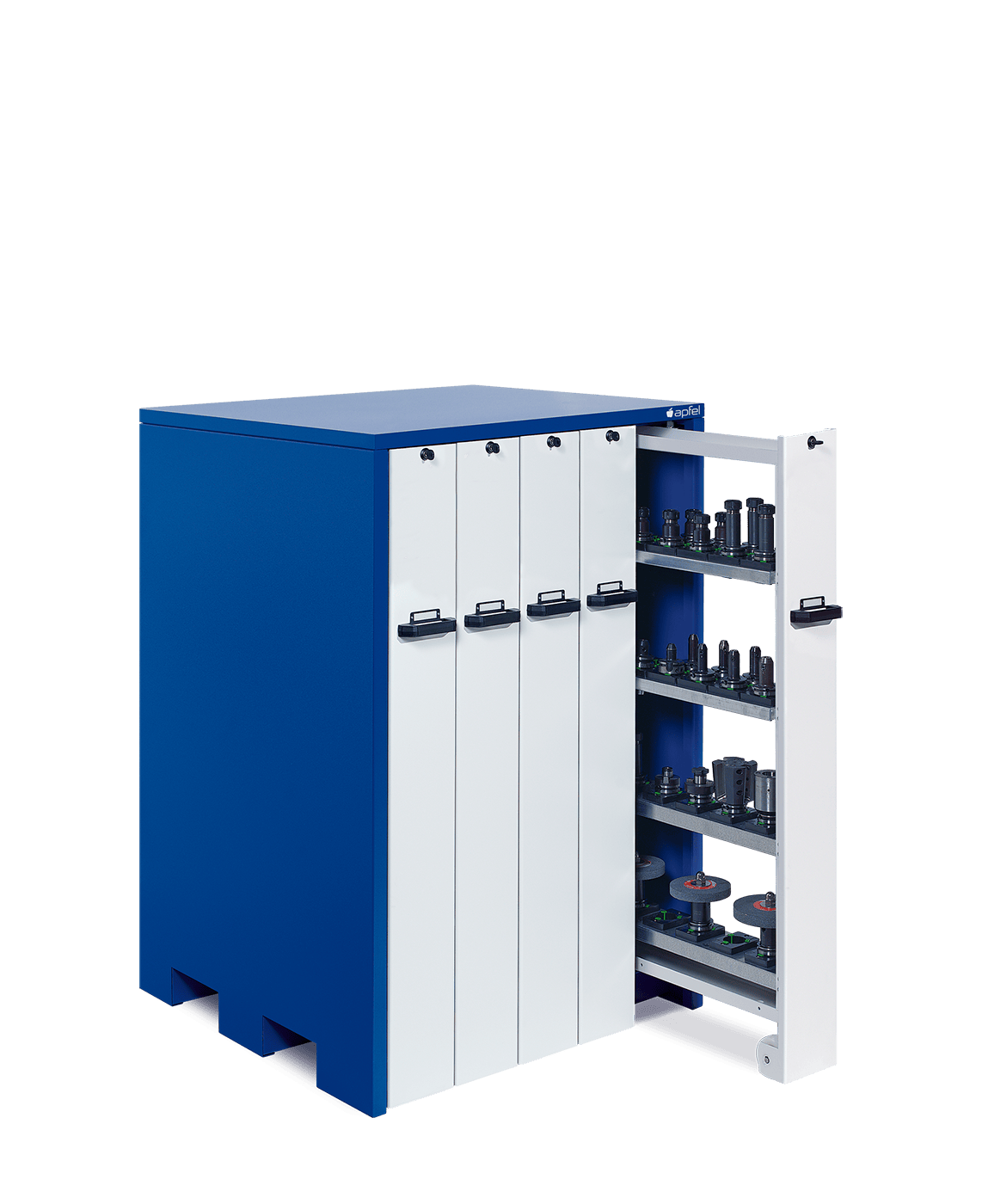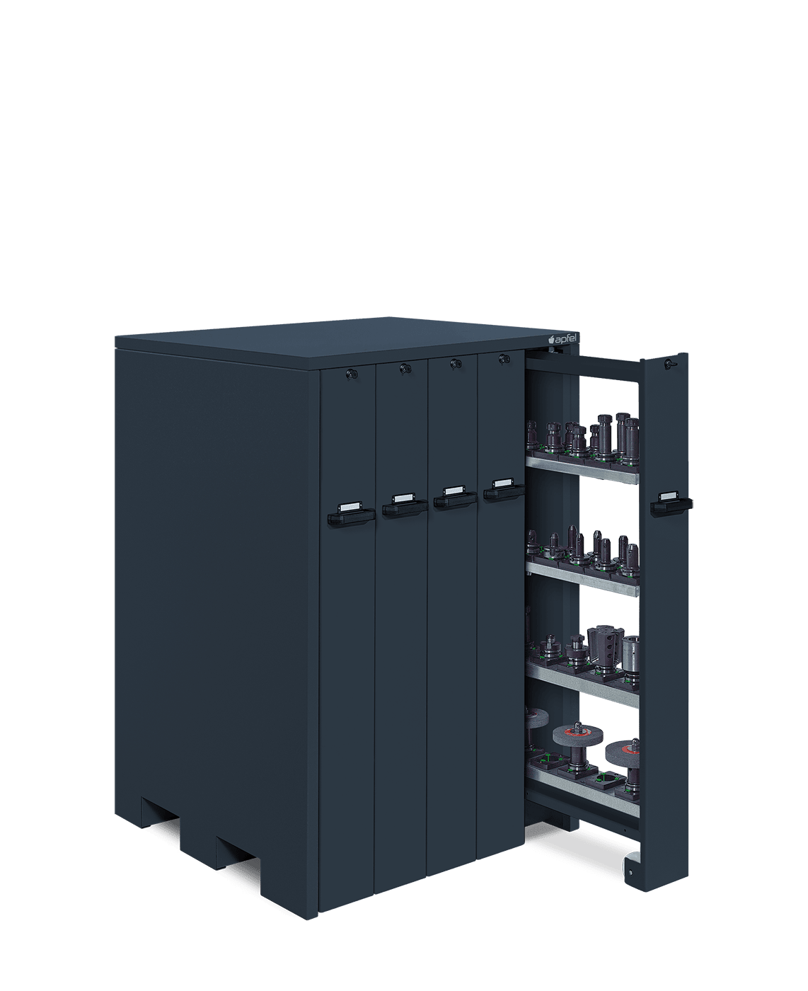 - Platzsparende Lagerung für alle gängigen Werkzeugtypen: Mit Maßen von 1.620 mm Höhe, 1.040 mm Breite und 1.050 mm Tiefe bietet der Schrank die perfekte Lösung für bis zu 320 Werkzeuge – optimal für SK, HSK, VDI, ABS und Capto.